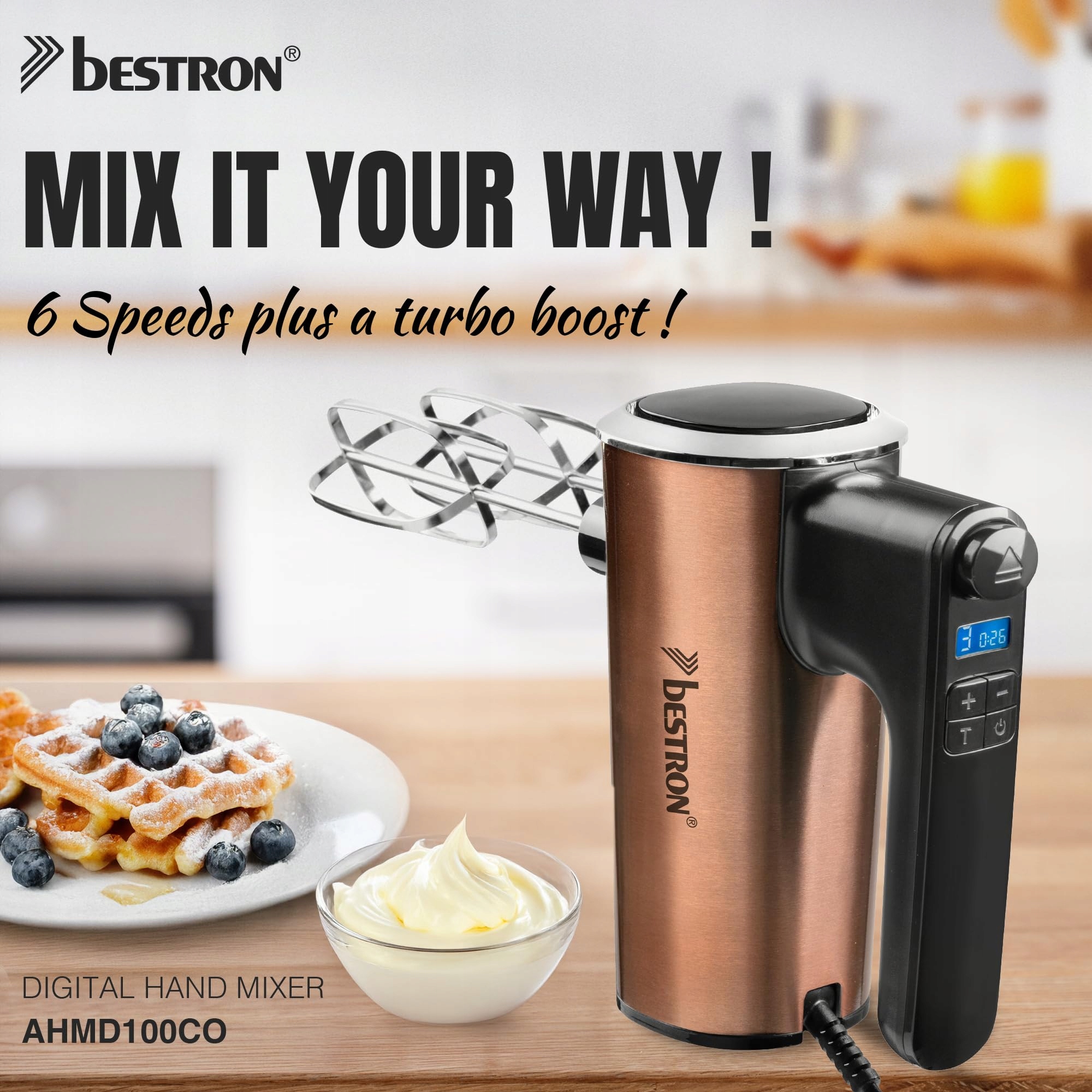 Bestron Power HandMixer, сильний ручний міксер з 6 рівнями, турбо -функцією та РК -дисплеєм, змішуванням пристрою, що включає 2 віночки та 2 гачки для замішування, легкий зважування 1 кг, колір: мідь