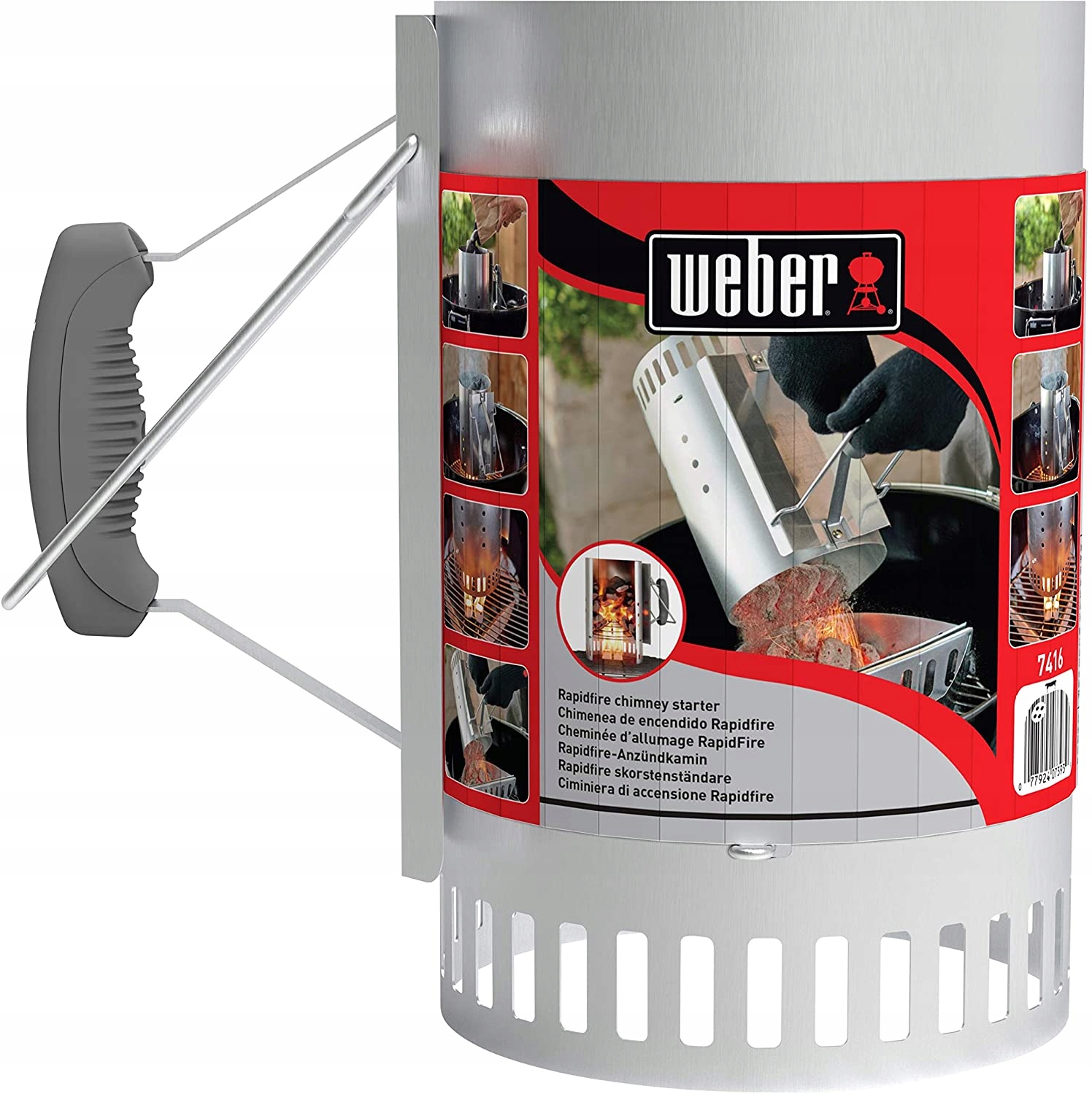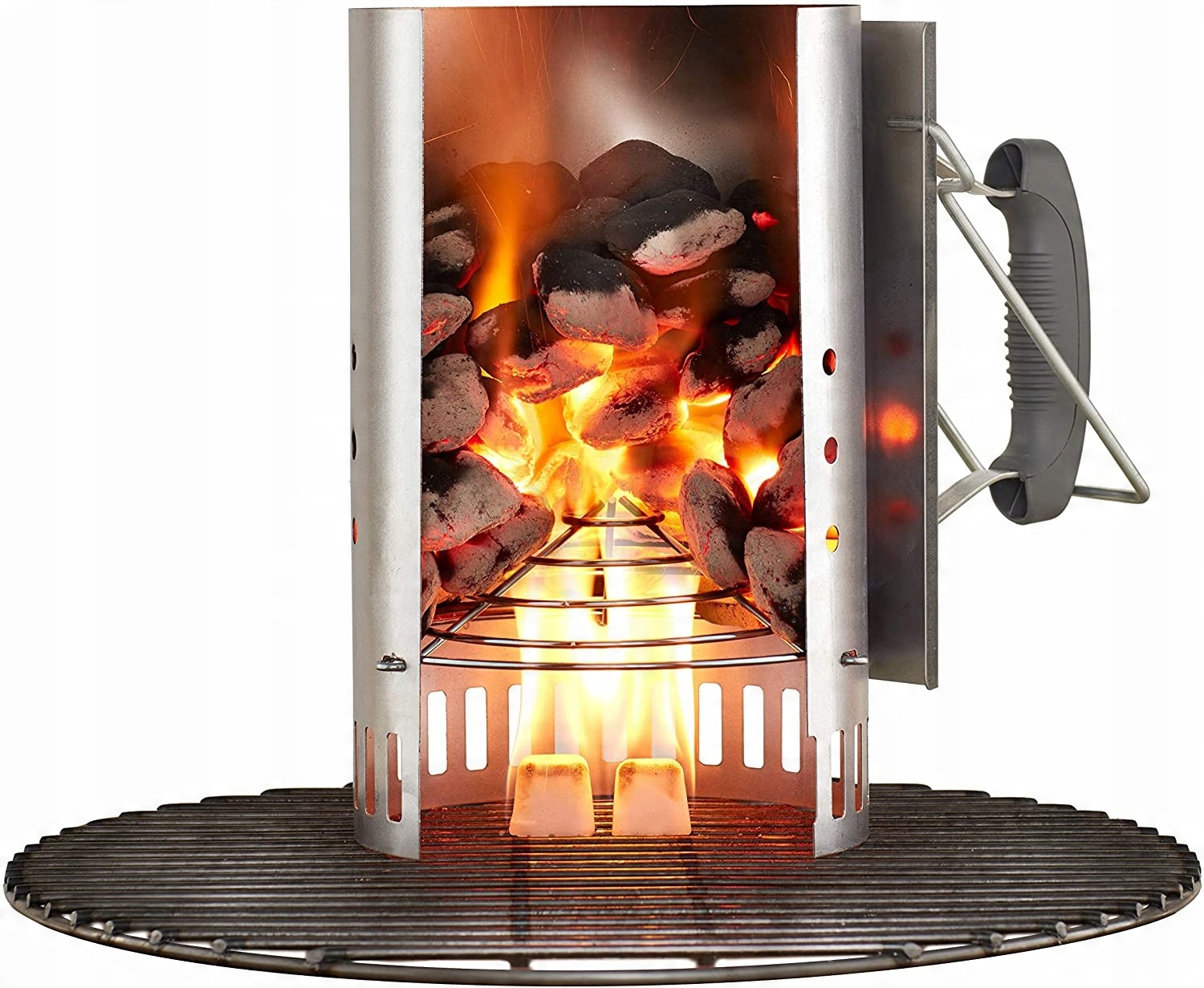 Найшвидший шлях до хрустких брикетів і ностальгічної атмосфери гриля на вугіллі починається з простого, але фантастичного пристрою. Димохід Rapidfire - найважливіший помічник кожного любителя барбекю. З його допомогою можна швидко освітлити вугілля і їжу на столі. Швидко розпаліть вугілля за допомогою необхідного інструменту для всіх грилів. Масивний димохід Rapidfire з алюмінізованої сталі має дві ручки. Це дає вам повний контроль при засипанні розпечених брикетів у гриль. Одягніть рукавички для гриля та візьміть термопластикову ручку в одну руку, а верхню дротяну ручку в іншу, щоб безпечно висипати брикети в гриль. У циліндричному контейнері достатньо місця для деревного вугілля, щоб заповнити решітку чайника. При цьому конічне дно забезпечує швидке і рівномірне розпалювання брикетів. Просто покладіть димохід Rapidfire на брусок запальнички або зім’яту газету, запаліть свою улюблену запальничку на грилі та чекайте розпечених брикетів — за менший час і зовсім без рідкої запальнички.