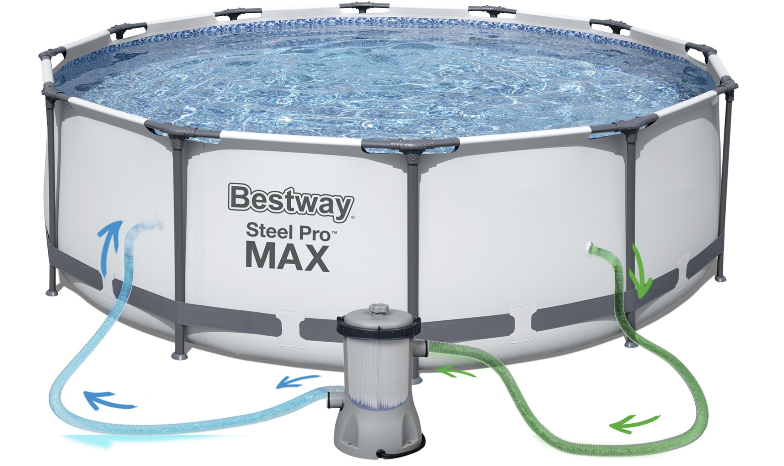 Включає фільтр -насос з фільтром II типу, який ефективно очищає воду. Ми рекомендуємо регулярно чистити фільтр та використовувати підготовку догляду за басейном.