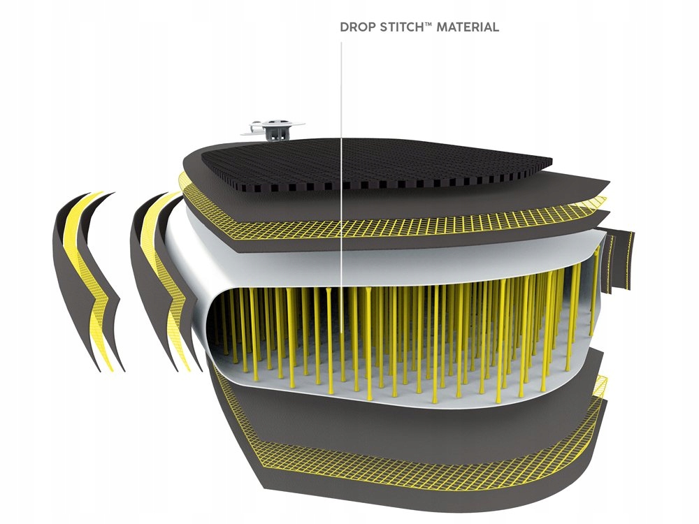 Все зроблено зі спеціального матеріалу Drop Stitch, це тисячі легких і міцних волокон, завдяки яким дошка має відповідну жорсткість.