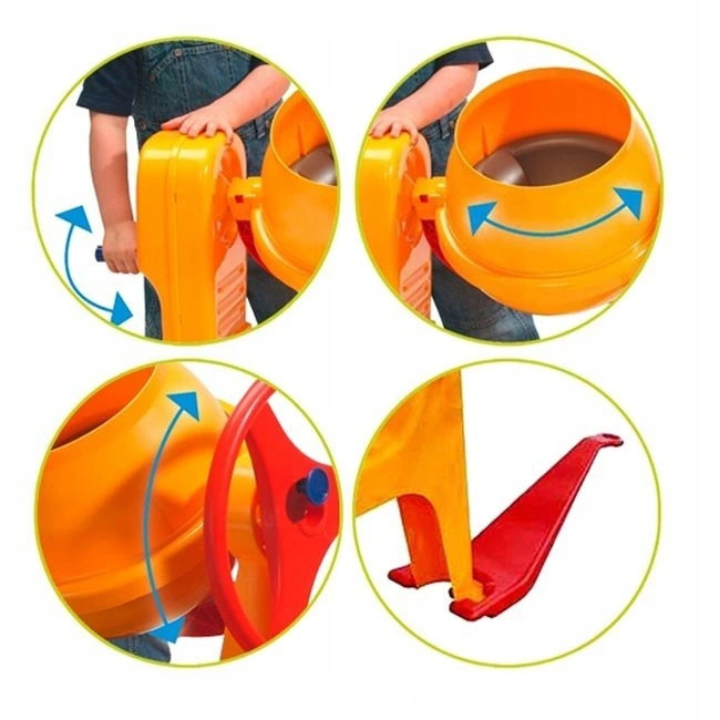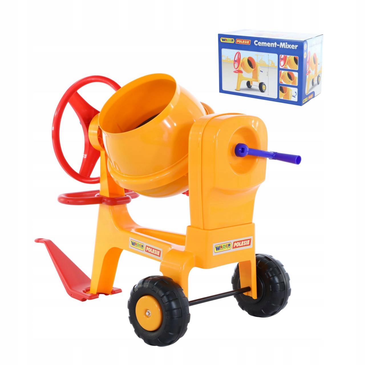 від POLESIEВона велика (її висота 67 см). , має великий барабан і ви можете змішувати різні інгредієнти у великих кількостях. Обертання рукоятки призводить до обертання барабана, а разом з ним і всього, що знаходиться всередині. Завдяки спеціальній ручці барабан бетономішалки можна нахиляти, що дозволяє легко спорожнити його. Іграшка має два широких колеса. Це дозволяє його транспортувати ефективно.