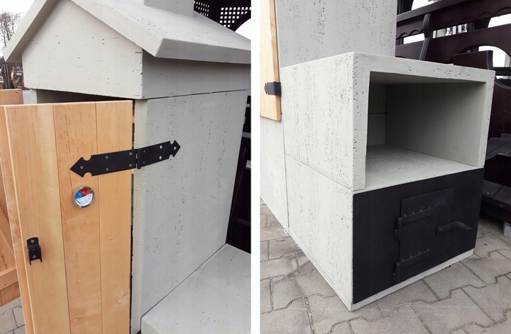 коптильня: висота 215 см, ширина 116 см (коптильня 58 см, топка 58 см), глибина 58 см