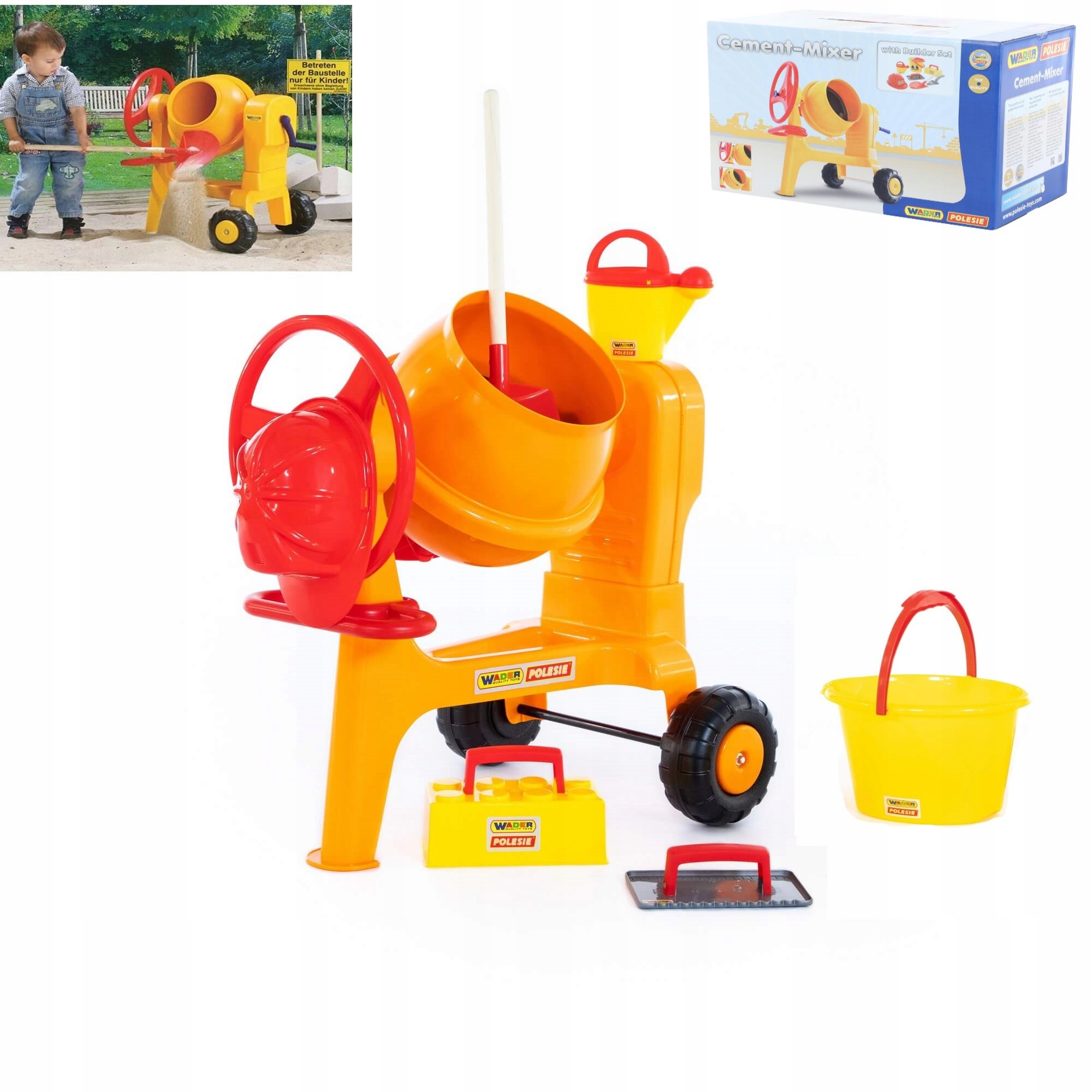 з ПОЛІСЯ . Він великий (його висота 67 см), має великий барабан і може використовуватися для змішування різних інгредієнтів у великих кількостях. Обертання рукоятки призводить до обертання барабана, а разом з ним і всього, що знаходиться всередині. Завдяки спеціальній ручці барабан бетономішалки можна нахиляти, що дозволяє легко спорожнити його. Іграшка має два широких колеса. Це забезпечує ефективне транспортування.