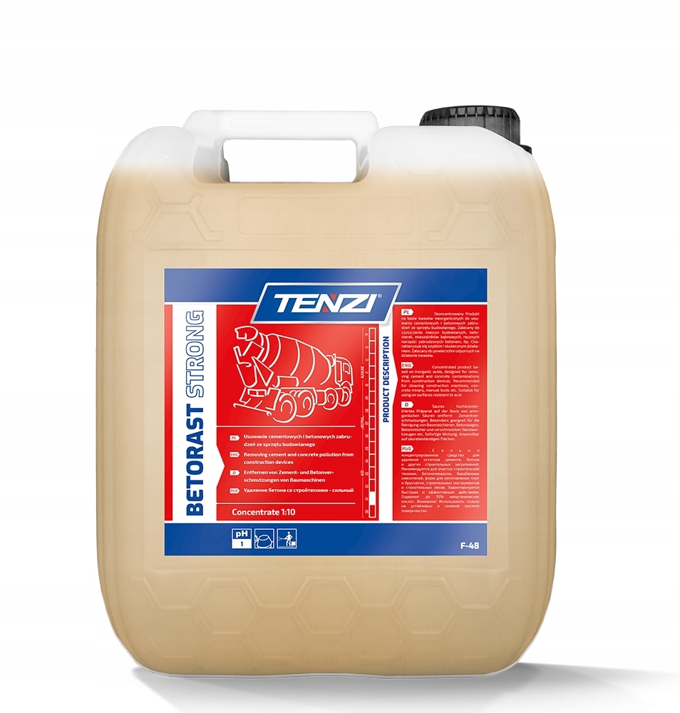 Концентрований продукт на основі неорганічних кислот для видалення цементного та бетонного бруду з будівельного обладнання. Рекомендується для очищення забруднених бетоном будівельних машин, бетономішалок, барабанних мішалок, ручних інструментів тощо. Характеризується швидкою та ефективною дією. Рекомендовано для кислотостійких поверхонь.