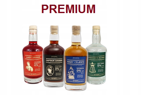 Лінія PREMIUM складається з чотирьох видів безалкогольних альтернатив Віскі, Джин, Ром, які виробляються нами в декоративних пляшках об'ємом 500 мл, а також відомого Італійський червоний аперитив. Ми пов’язали їхні імена з так і не розкритою таємницею зникнення екіпажу вітрильника «Мері Селеста», у трюмах якого перевозили бочки зі спиртом. Одна з гіпотез, висунутих для пояснення цієї таємниці, стосується шкідливості зловживання алкоголем. Ми гарантуємо, що після споживання нашої продукції ви ніколи не заблукаєте по дорозі додому.