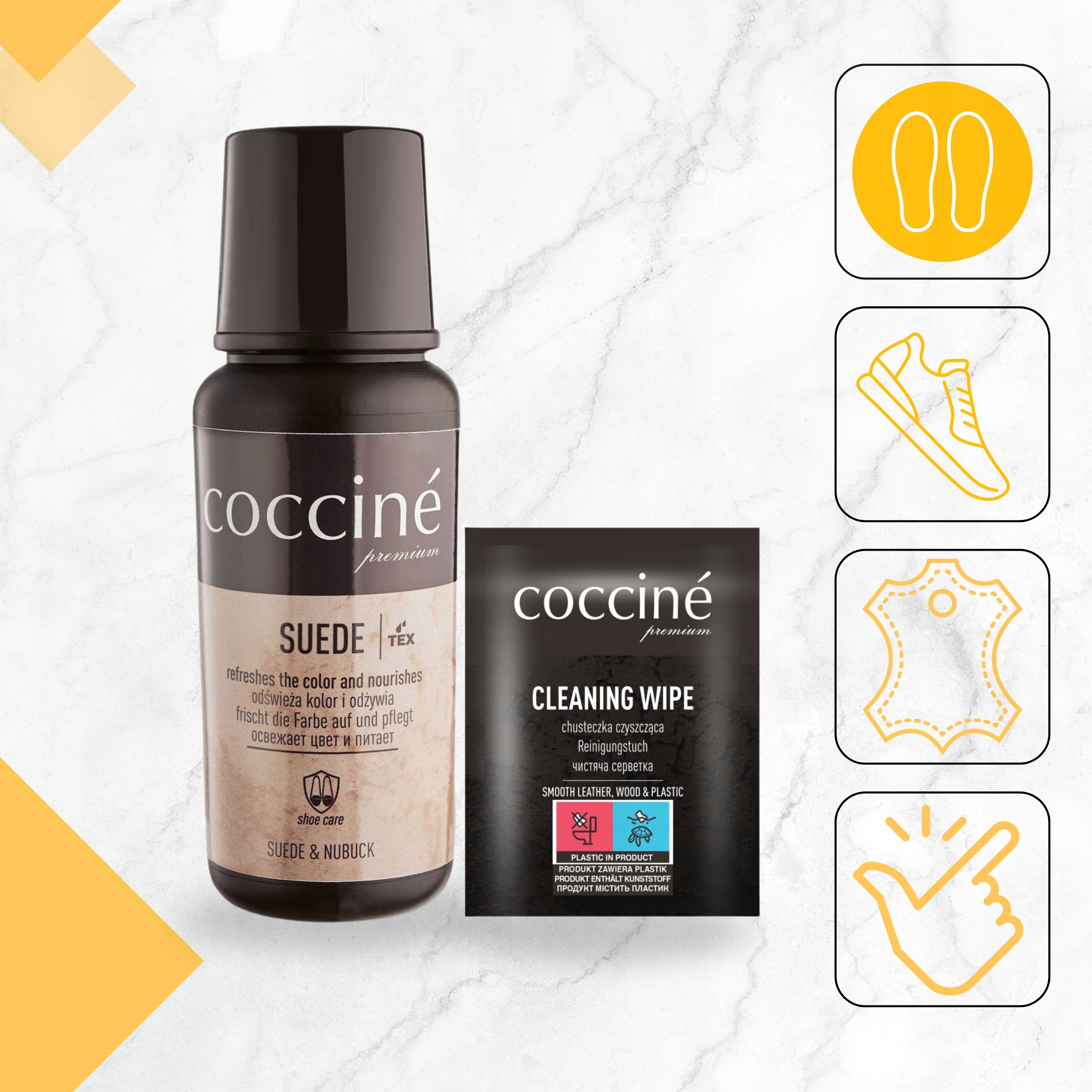 Coccine Clean Wipe – незамінний гаджет у вашій сумці чи кишені. Завдяки цьому ви завжди будете готові до несподіваних плям і забруднень, забезпечуючи естетичний вигляд вашого взуття та шкіряних аксесуарів. Обирайте комфорт та ефективність – обирайте перевірений продукт від відомого бренду Coccine!