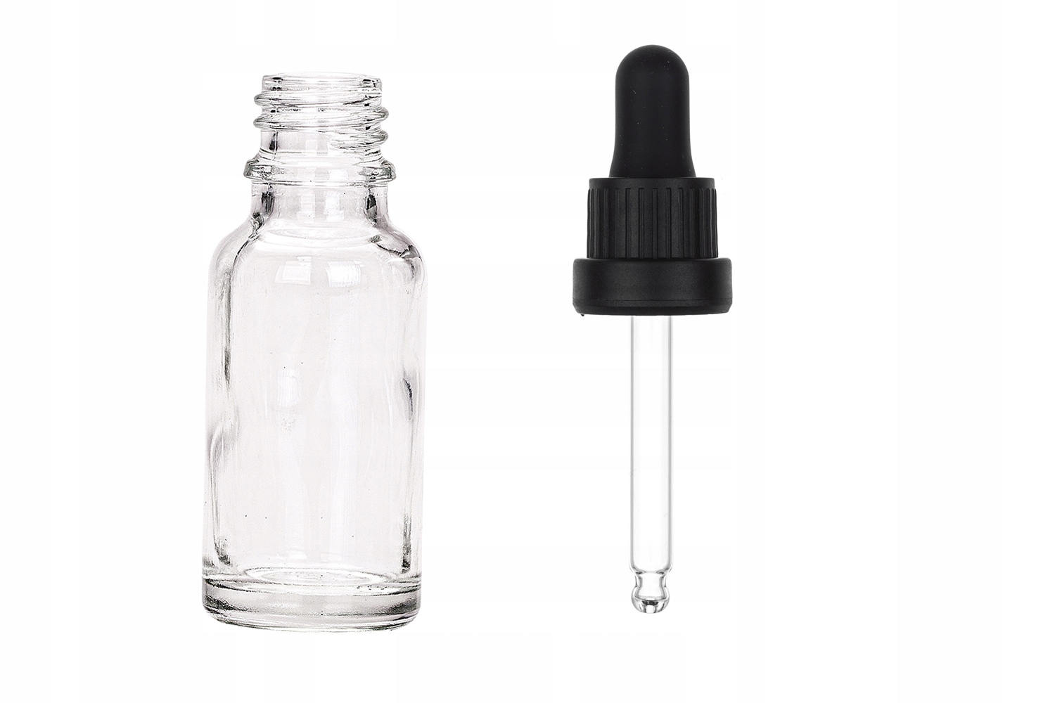 Безбарвна скляна пляшка ємністю 20 мл зі скляною піпеткою.