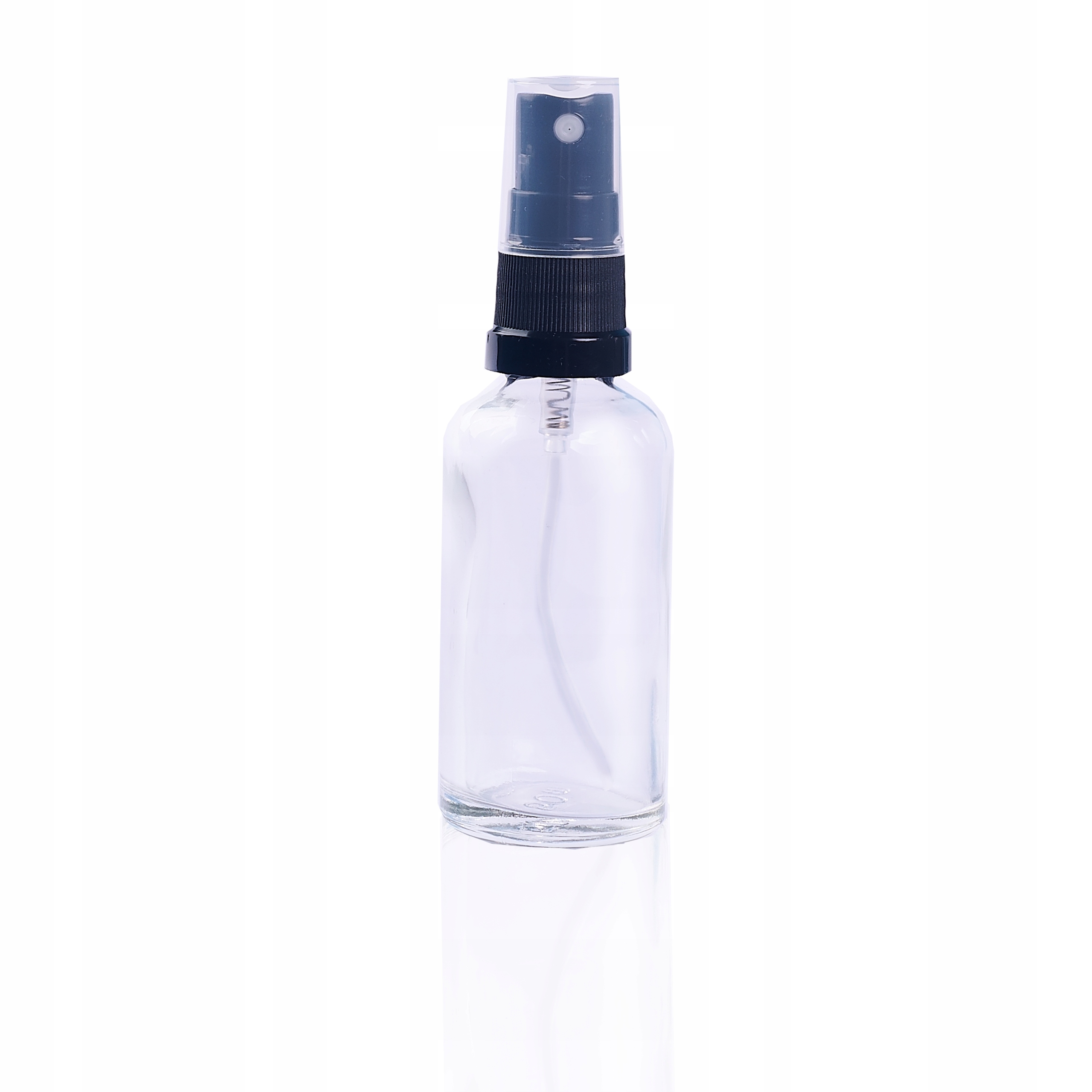Безбарвна скляна пляшка 50 мл з чорним розпилювачем і безбарвною кришкою