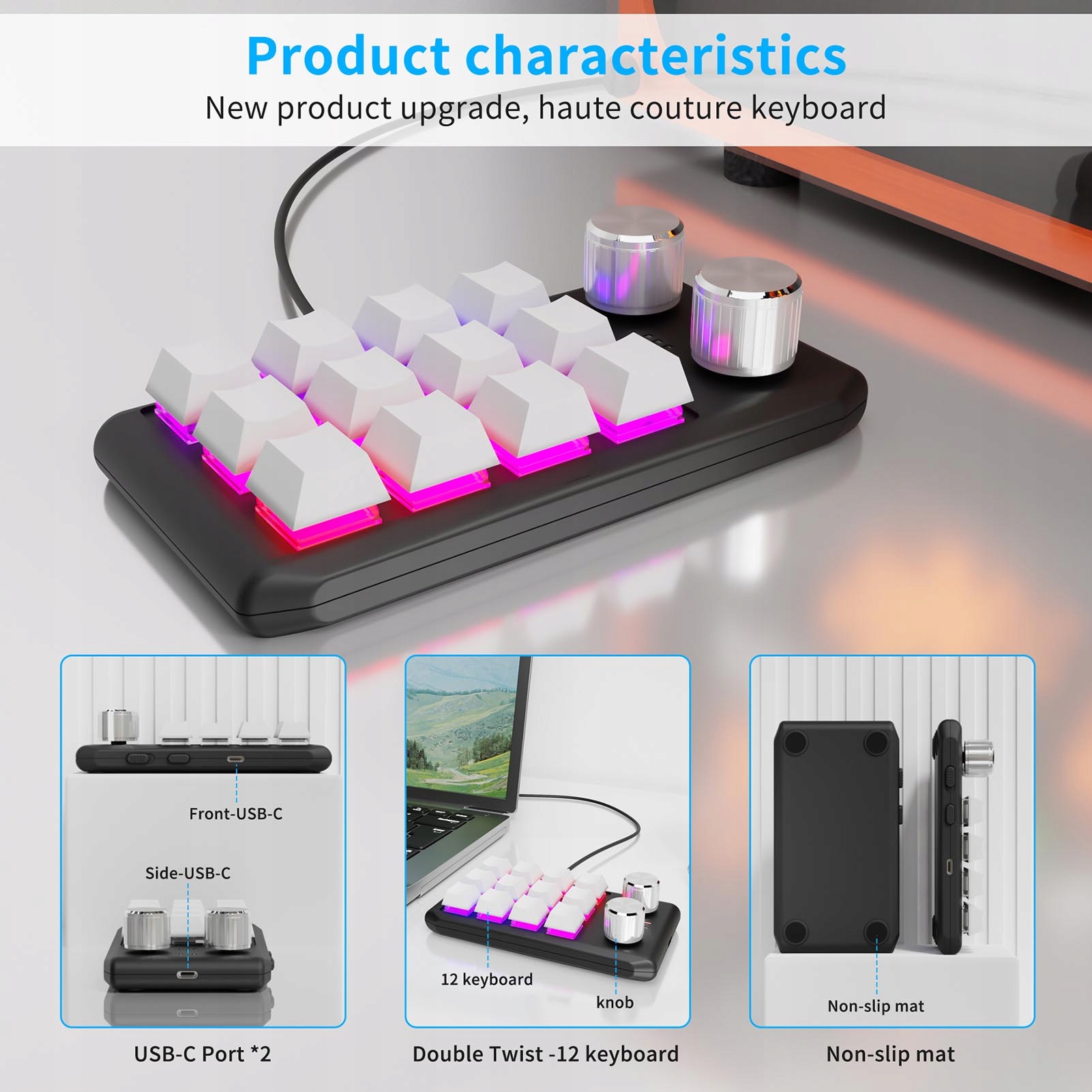 1. Настроювані клавіші: кожну з 12 клавіш і подвійних ручок можна програмувати, що дозволяє персоналізувати керування програмним забезпеченням для ігор і дизайну.