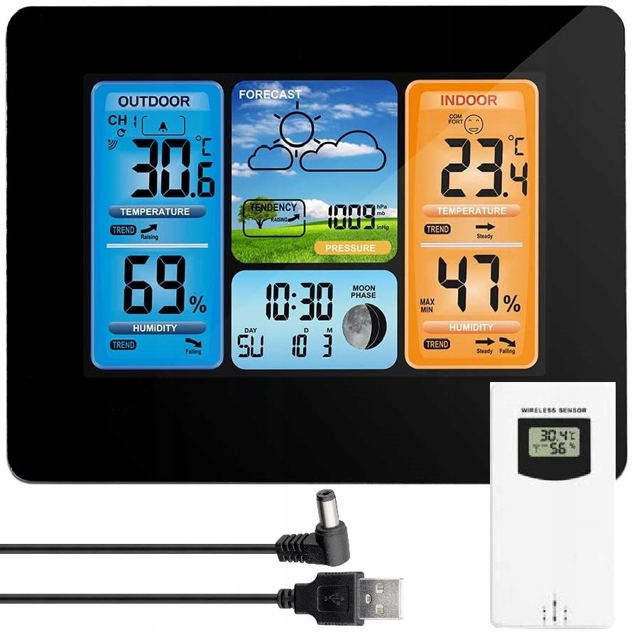 Пристрій має дуже сучасний дизайн , тому він точно не буде спонукати приміщення. Станцію можна розмістити безпосередньо на столі , будь то полиця чи , підвішені на стіні у будь -якій кімнаті. Зовнішній датчик працює від батарей (2x LR6 AA), а також метеостанція з батареями (2x LR6 AA) або через USB -кабель. Продукт має барвистий РК , з якого дуже легко прочитати всі значення для нас, що цікавлять.