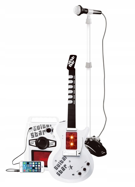 Ідеальний гітарний набір для дітей - гітара, стійка з мікрофоном і підсилювачем. Гітара має 6 металевих струн. Ви можете грати кінчиками пальців, нігтем або кубиками (не входять у комплект).