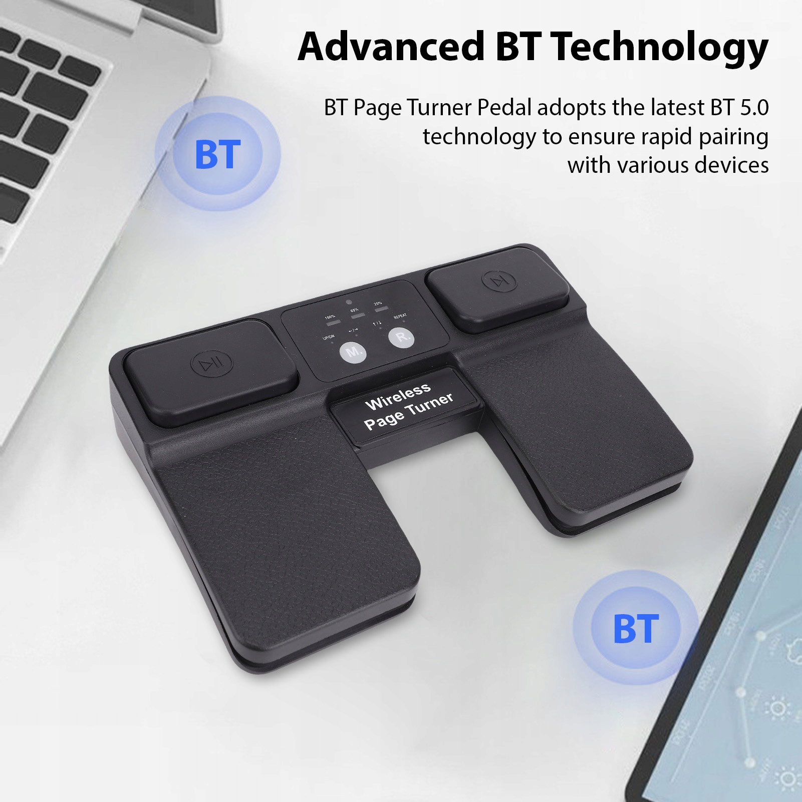 Функція:1. Передова технологія BT: наша педаль Turner BT Page використовує найновішу технологію BT 5.0, забезпечуючи швидке з’єднання з різноманітними пристроями, включаючи iOS, Android, NaNaMac і Windows. Відчуйте безперебійне підключення та стабільну передачу даних, що звільняє ваші руки для більш комфортної гри.