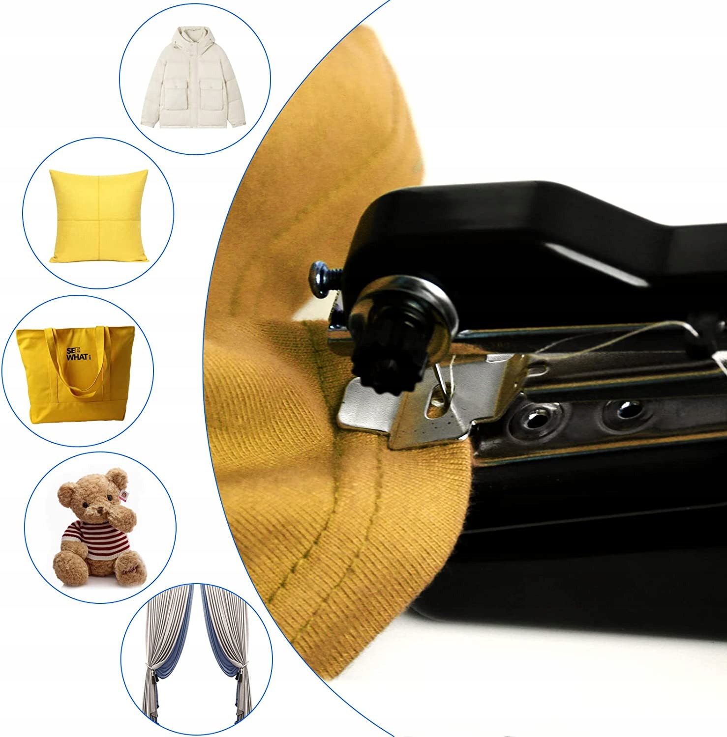 Маленька домашня швейна машина, придатна для тканин, одягу, штанів, джинсів, футболок, штор та приладдя. Його також можуть використовувати початківці, і діти можуть створювати самостійно роботу, пришити маленький одяг, серветки з носом тощо. Це не лише іграшка, але також може вирощувати хороші дитячі звички та забезпечити більше задоволення.