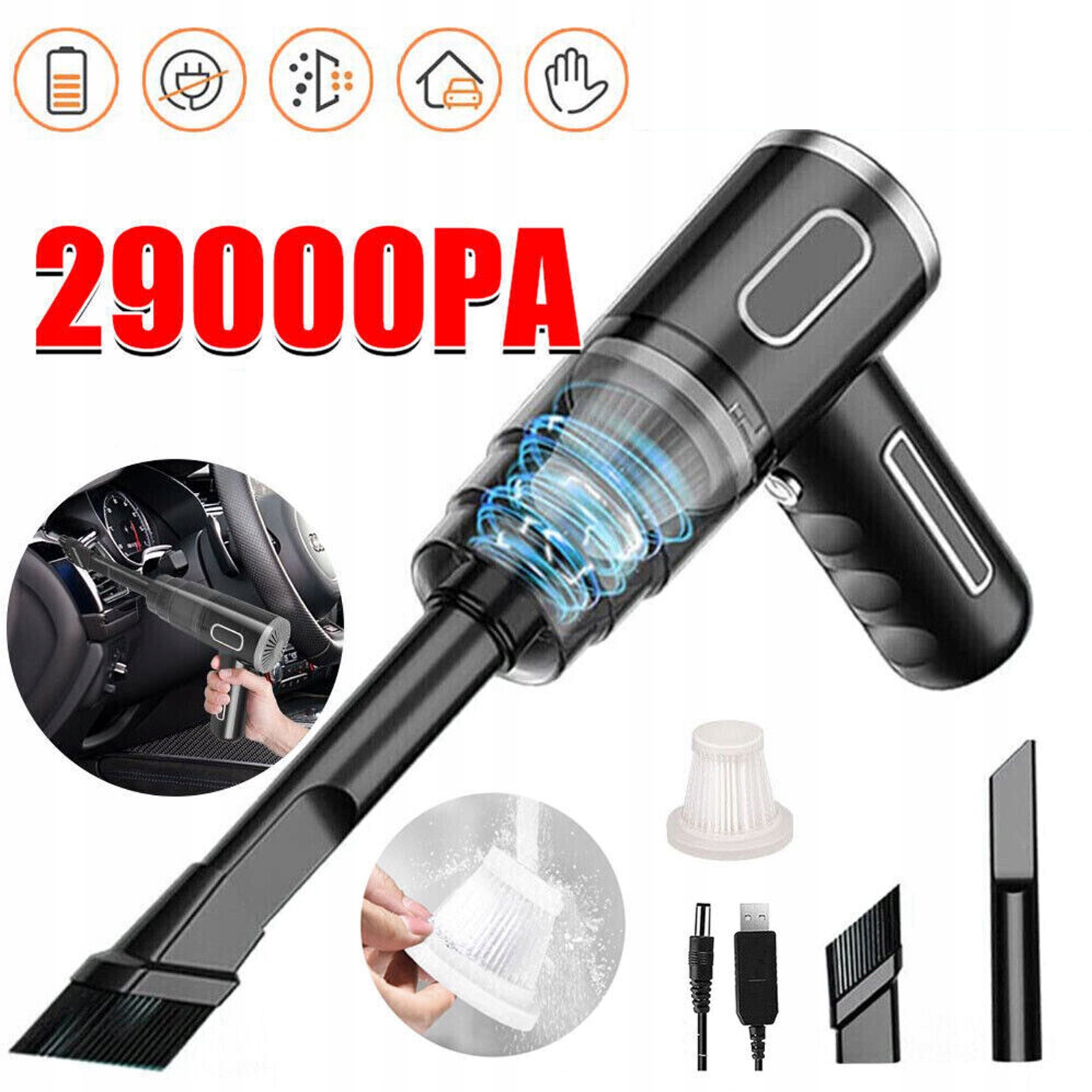 🚗🚗 вакуумний очищувач ручного автомобіля має сильний смоктання 29000 ПА, що підходить для щоденного домашнього завдання для видалення пилу. Двигун з дуже високою вихідною потужністю 120 Вт забезпечує сильне смоктання до 29 000 ПА, тому ви можете швидко та легко видалити залишки їжі, молекули та волосся на тваринах з дому чи автомобіля.