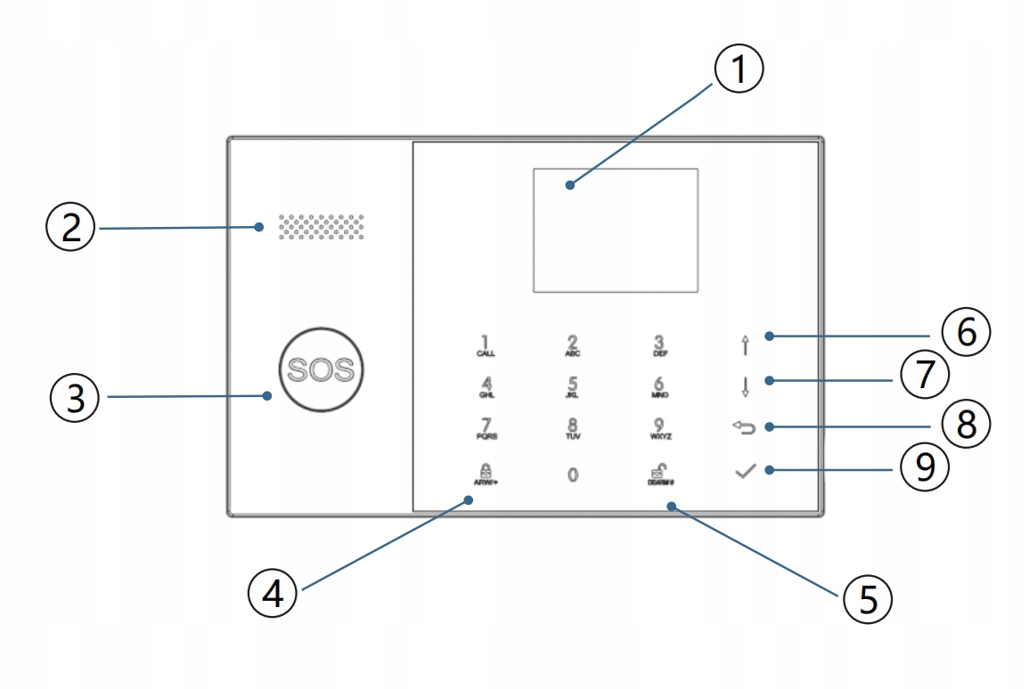 ①Екран дисплея розміром 2,4 дюйма для відображення стану системи, годинника, інформації про тривогу зони, меню, звуків тривоги та службового голосу.