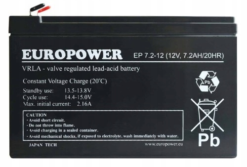 Europower EP 7,2-12Необслуговувана герметична свинцево-кислотна батарея. Акумулятор був розроблений в основному для систем сигналізації. Завдяки дуже хорошому співвідношенню ціни та якості акумулятори Europower є ідеальною пропозицією для всіх, хто шукає високоякісний продукт, який гарантує безвідмовну роботу протягом багатьох років. Батареї Europower довели свою довговічність і надійність у тисячах установок сигналізації.