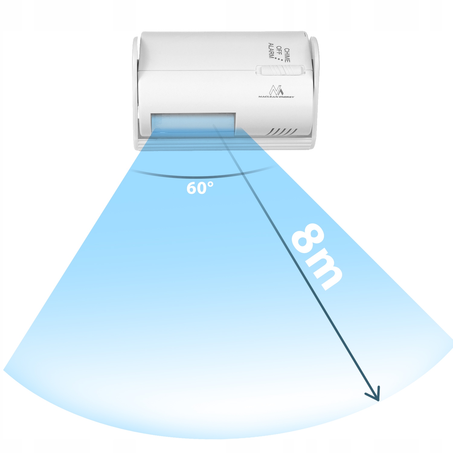 Датчик виявляє рух на відстані до 8 метрів і під кутом 60°.