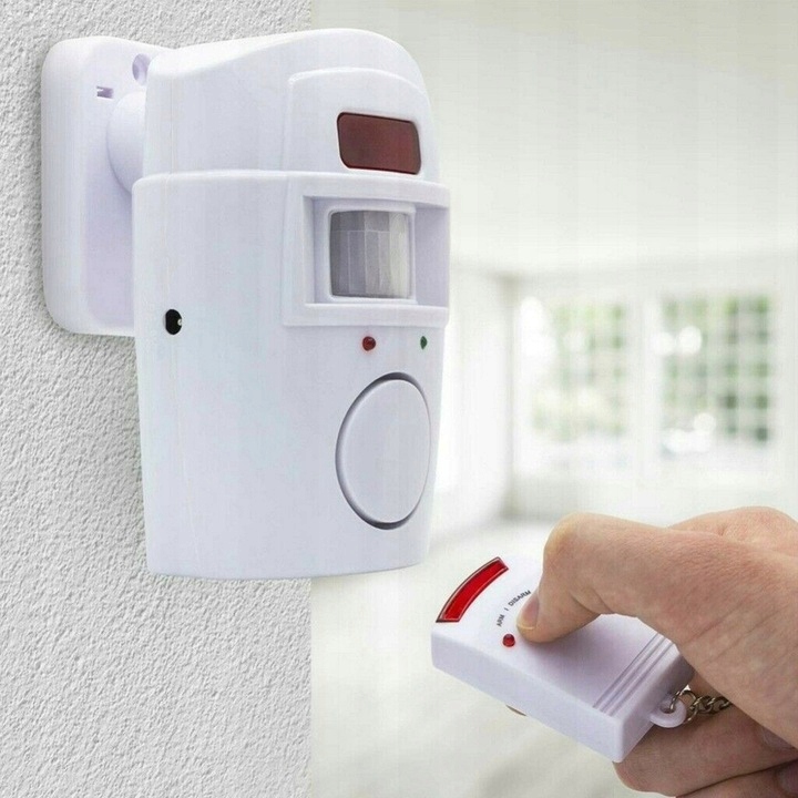 СИГНАЛІЗАЦІЯ З ДАТЧИКОМ РУХУ - БЕЗДРОТОВА, НА АКУМУЛЯТОРІ. Датчик руху, радіус дії до 6 м, живлення від батарейок 4xAA, гучний звуковий сигнал до 105 дБ, настінний або окремий монтаж, два пульти дистанційного керування в комплекті.