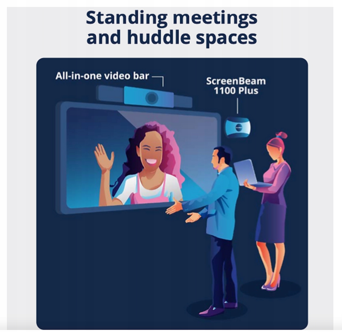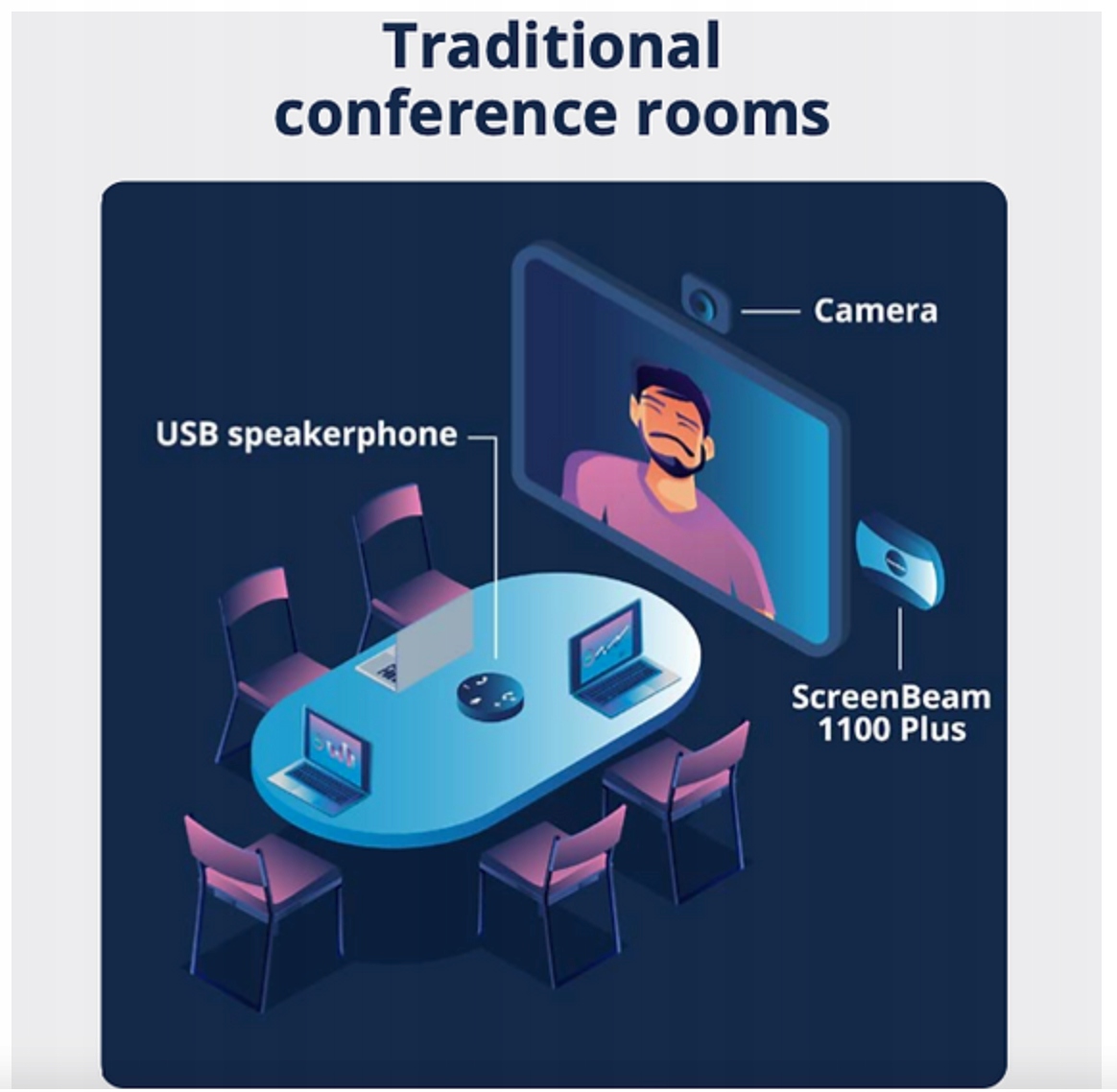 За допомогою ScreenBeam 1100 Plus користувачі можуть брати участь у запланованих або спеціальних нарадах, використовуючи свій ноутбук і вибрану службу конференц-зв’язку UC, а також використовувати всі переваги периферійних пристроїв конференц-залу, таких як камера, звукова панель, пристрої «все в одному», і мікрофони.
