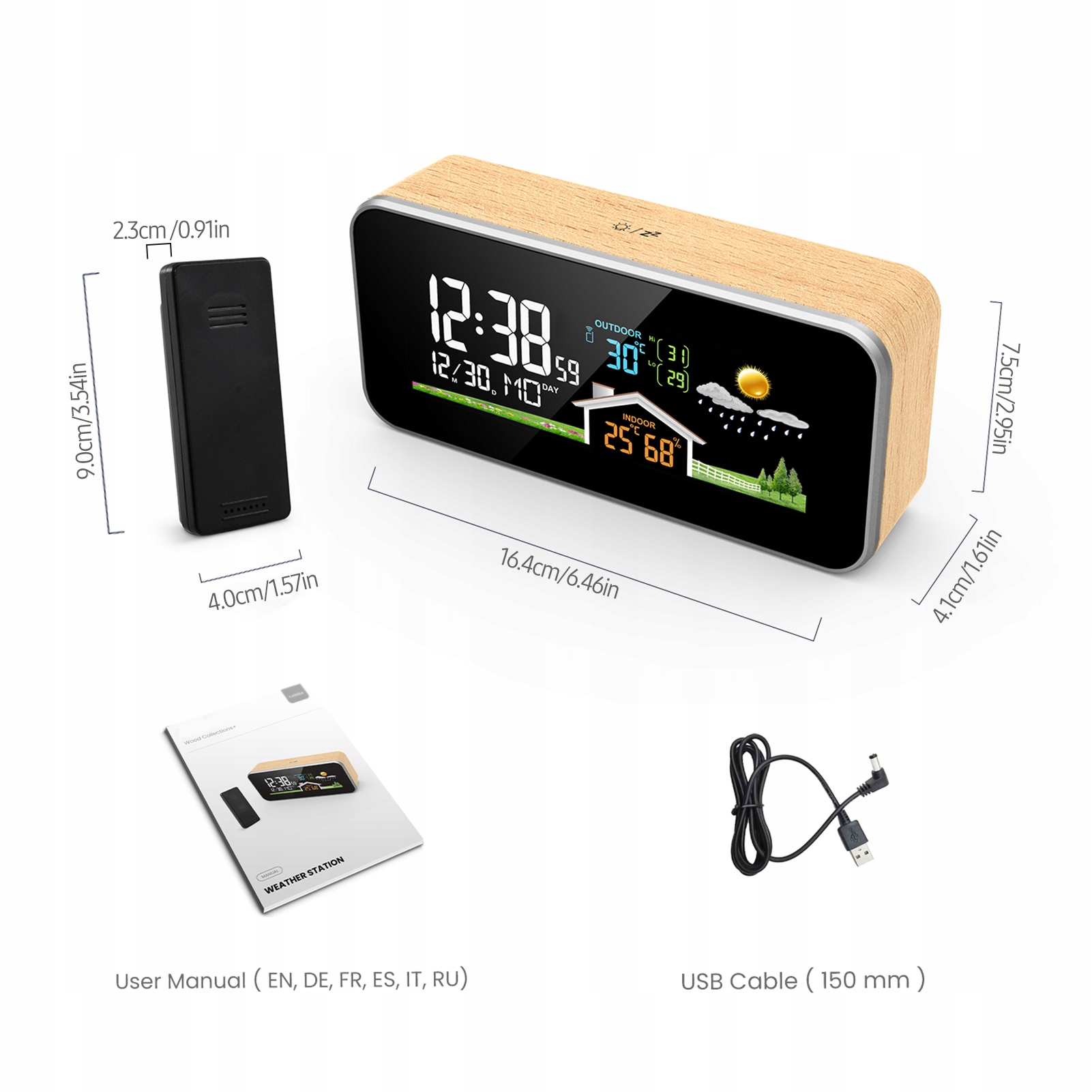 1. Світлодіодний екран: Монітор температури та вологості з великим кольоровим дисплеєм, який показує вичерпну інформацію: зовнішня температура (HI/LO), температура та вологість у приміщенні, година (12/4h)/дата, прогноз погоди та будильник.