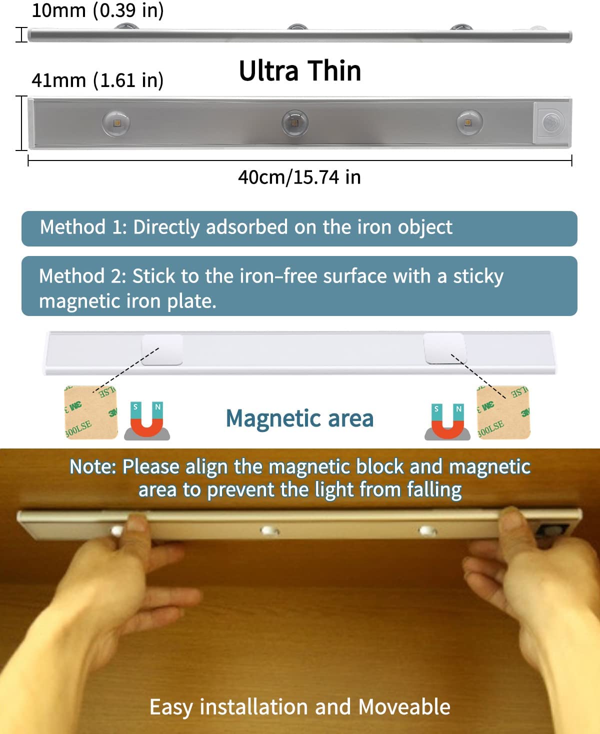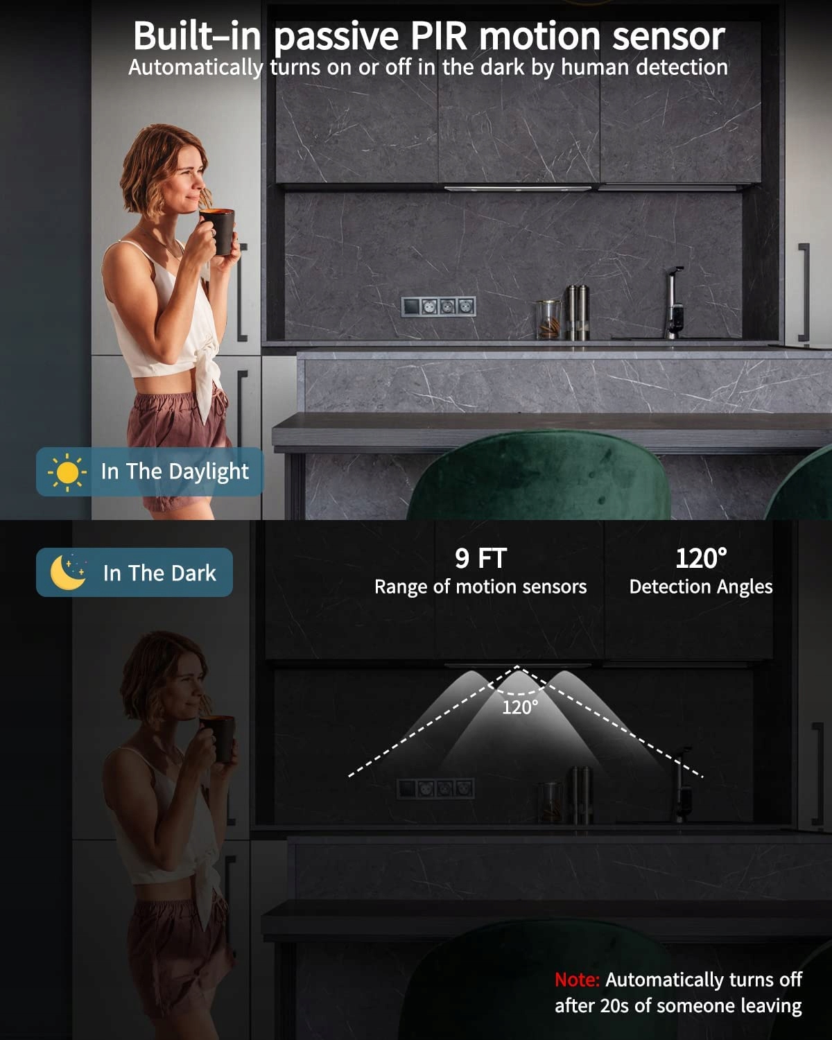 3 РЕЖИМИ РОБОТИ НЕОБОВ’ЯЗКОВО - освітлення шафи з датчиком руху ELKCIP має 3 режими ввімкнення, завжди увімкнено, вимкнено або режим датчика руху. Тож ви можете використовувати ці гардеробні лампи як звичайну нічну лампу або датчик руху для вашої шафи/шафи/шухляди. У режимі датчика руху та в темряві ці освітлювальні прилади під шафою автоматично виявляють рух людини в межах 10 футів/120° і вимикаються через 20 секунд відсутності руху.
