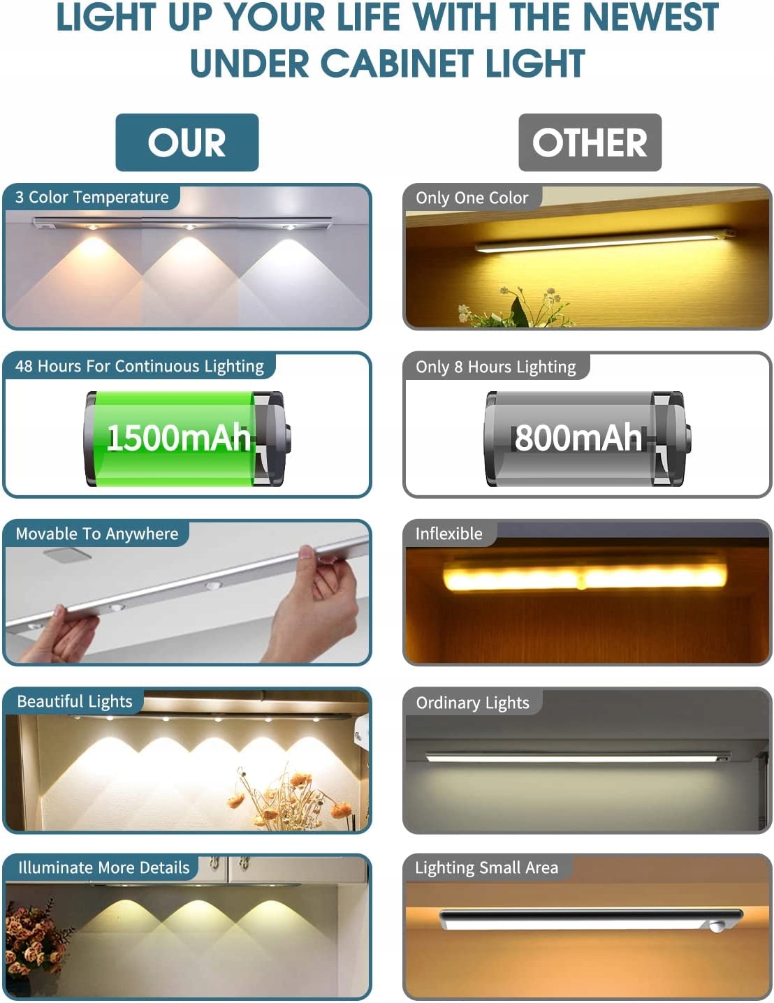 3 КОЛЬОРНІ ТЕМПЕРАТУРИ ТА СТУПІНЧЕВЕ ЗАТЕМНЮВАННЯ - Кухонне освітлення під стільницею має три колірні температури: білий (6000 К), природний (4000 К) і теплий (3000 К), тому ви можете вибрати колірну температуру за бажанням. Режим плавного затемнення підтримує регулювання яскравості від 30% до 100% відповідно до різних місць і діапазонів областей.