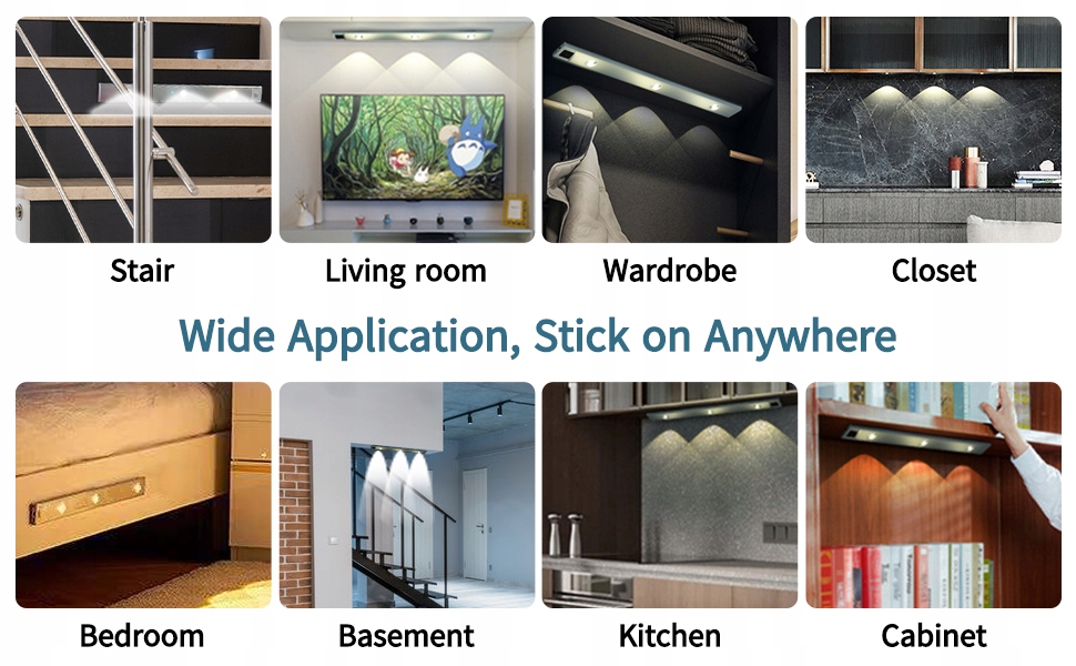 ШИРОКЕ ЗАСТОСУВАННЯ - Цю акумуляторну світлодіодну лампу можна використовувати не лише як кольорове розсіяне освітлення та декоративне настінне освітлення, а й як спальню, гардероб, шухляда, ящик для інструментів, дитяча, гардероб, шафа, коридор, майстерня, підвал, гараж, сходи, під'їзд до гаража, комора та інші місця.