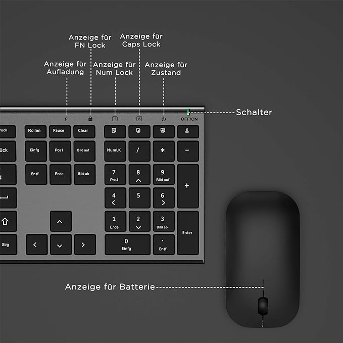 ⭐ Бездротова акумуляторна клавіатура та миша Seenda 2.4G, німецька клавіатура QWERTZ, тонка радіоклавіатура QWERTZ, для Windows/ПК, комп’ютера, ноутбука, Smart TV, сірий і чорний ⭐