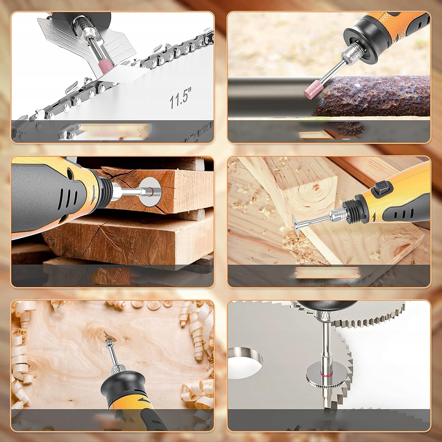 ✅ -набори заточення ланцюга фальшивки: Електрична точилька ланцюга виготовлена з високоякісних матеріалів і містить різні аксесуари для заточкових ланцюгів, різання деревини та каменю, різьблення, свердління, шліфування, полірування, свердління та складання.