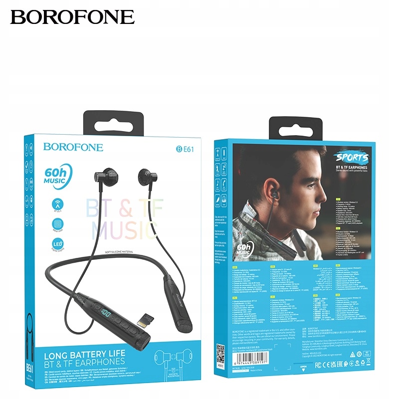BOROFONE BE61 Travelerце бездротові спортивні навушники-вкладиші з технологією Bluetooth 5.3, оснащені з'єднувальний кабель довжиною 83 см, шийний ремінь, а також магнітні корпуси для запобігання втраті та заплутування навушників. Навушники мають мікрофон, який дозволяє здійснювати телефонні дзвінки та кнопки для керування музикою, гучністю або телефонними дзвінками та розмовами. Вони також мають світлодіодний дисплей, який показує стан заряду акумулятора, і слот для карт пам’яті microSD/TransFlash.