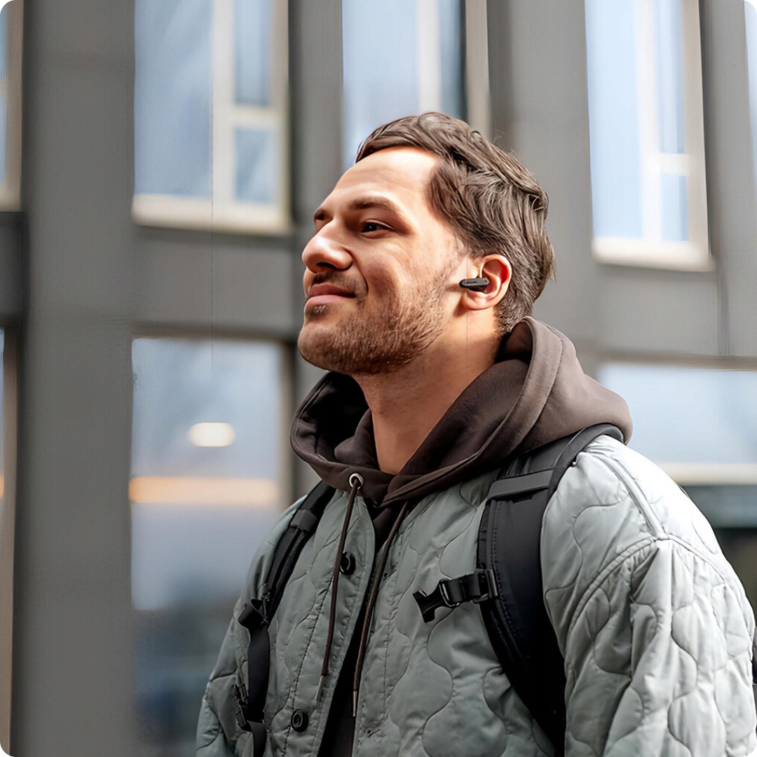 Кожен навушник розміщується у зовнішній частині вуха без необхідності вставляти його у слуховий прохід. Тонка конструкція з тонким штифтом дозволяє надійно тримати навушники у вусі, не створюючи жодного дискомфорту навіть після багатьох годин використання.