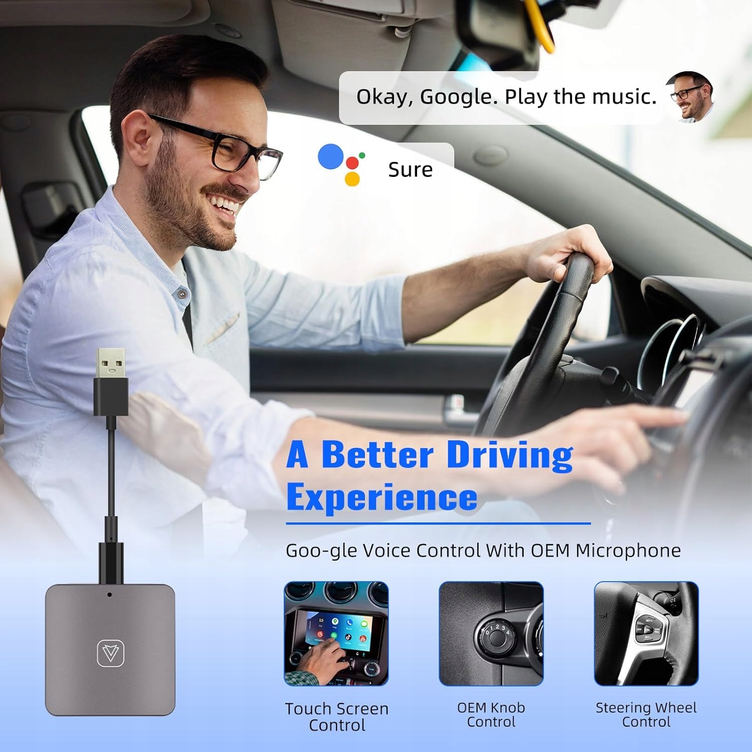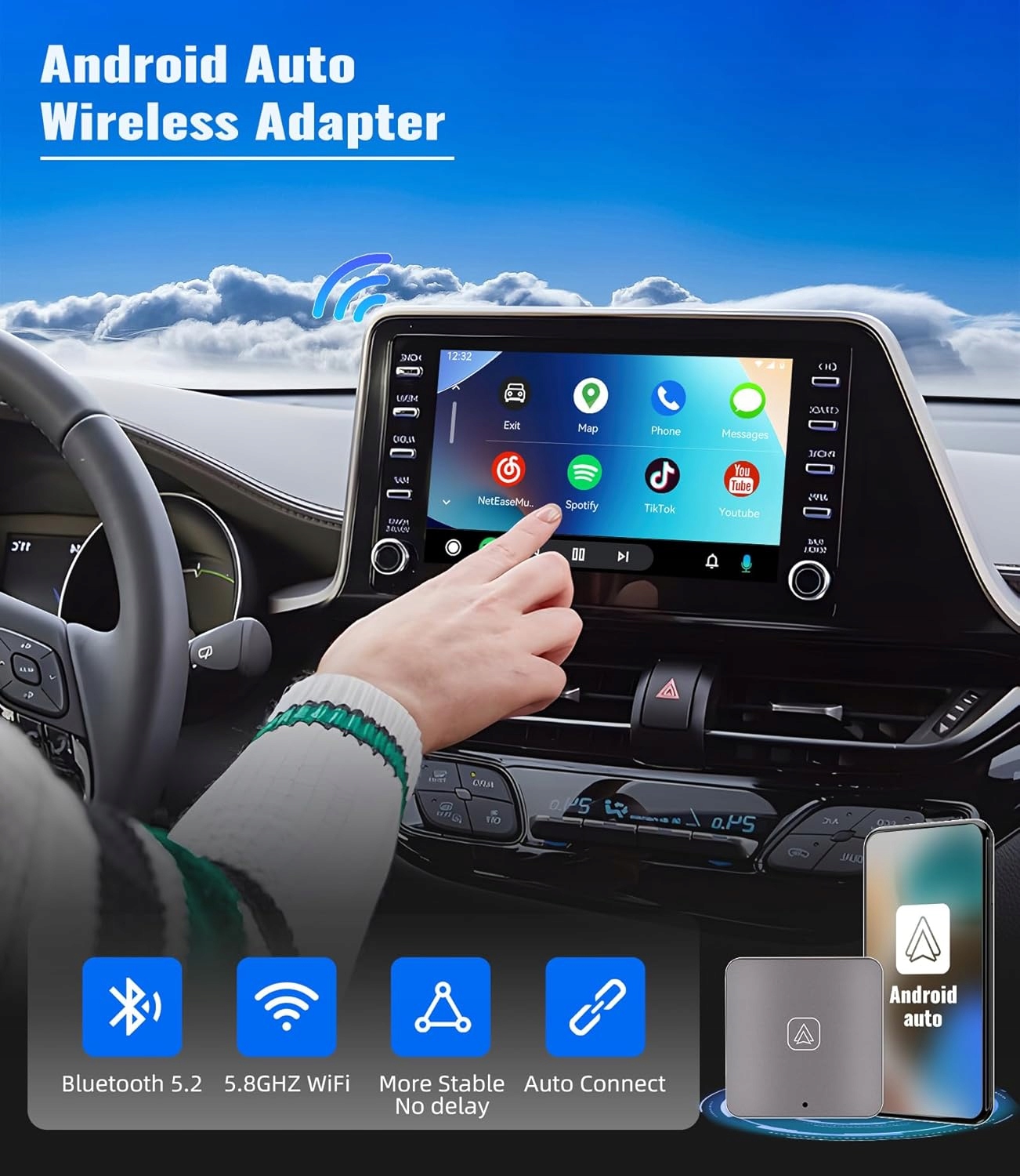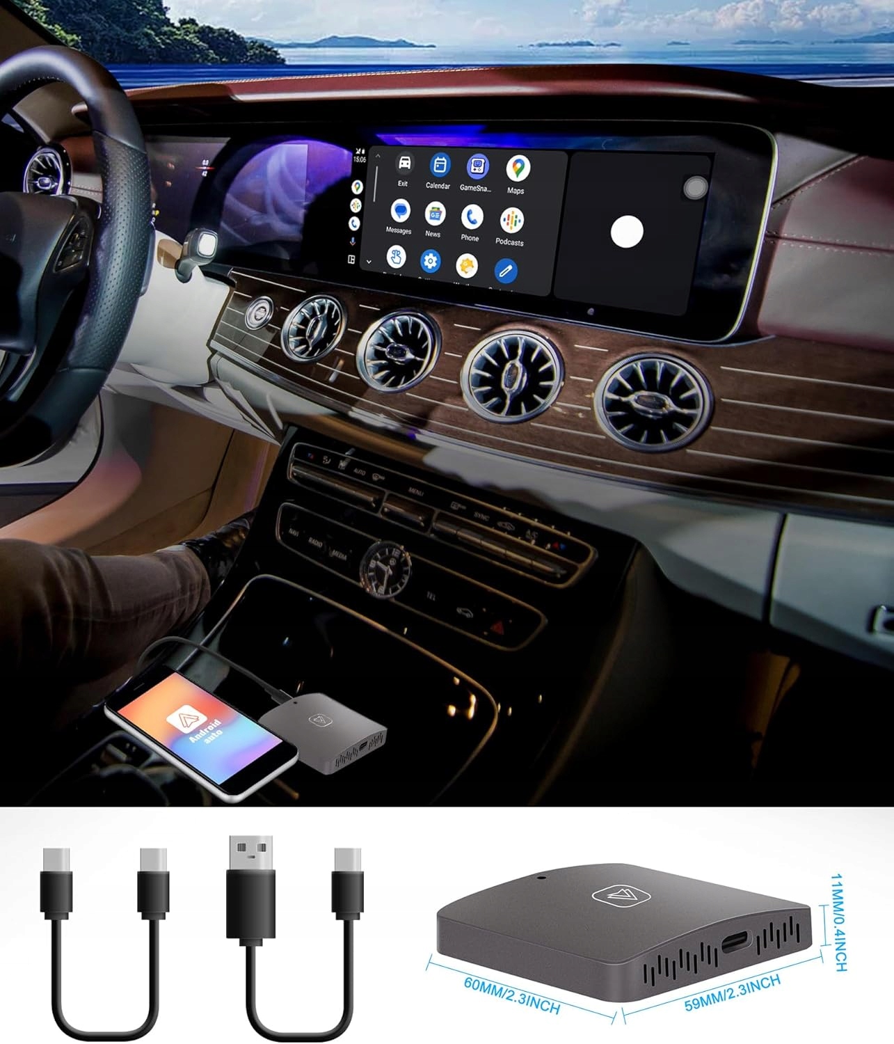 Адаптер бездротового автомобіля Android - це просте рішення, що усуває необхідність використання кабелів при використанні Android Auto в автомобілі. Це дозволяє бездротовим підключенням до системи розважальної системи, підтримуючи всі функції, такі як навігація, музика та голосовий помічник.