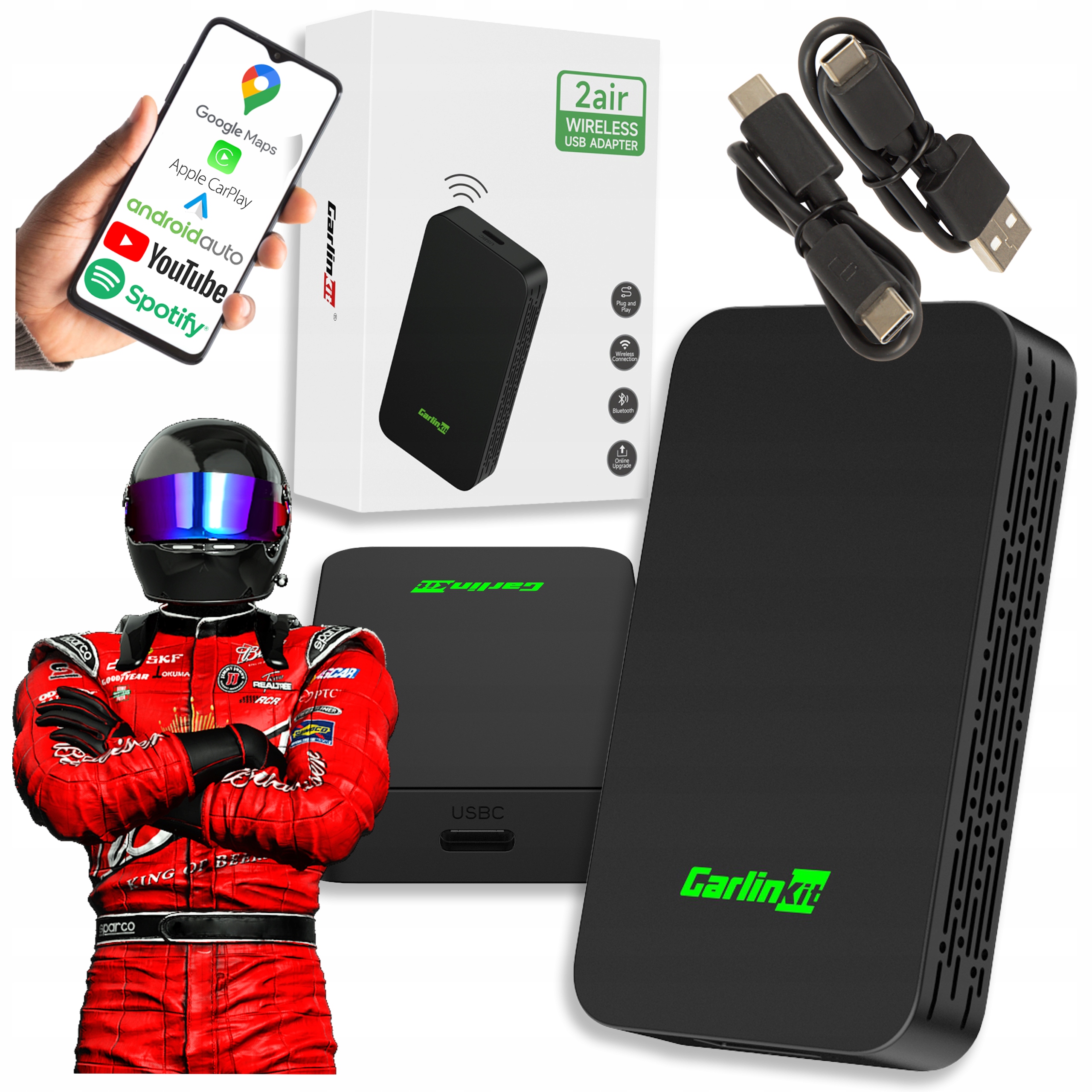 CarlinKit 5.0 2air найновіший бездротовий автомобільний адаптер для Android Auto та CarPlay. Він може перетворювати дротовий Android Auto або дротовий CarPlay на бездротовий. Плавне перемикання функцій телефону на екран автомобіля. Зручне відтворення музики, навігація, також підтримується голосове керування, Siri, Google Assistant тощо.