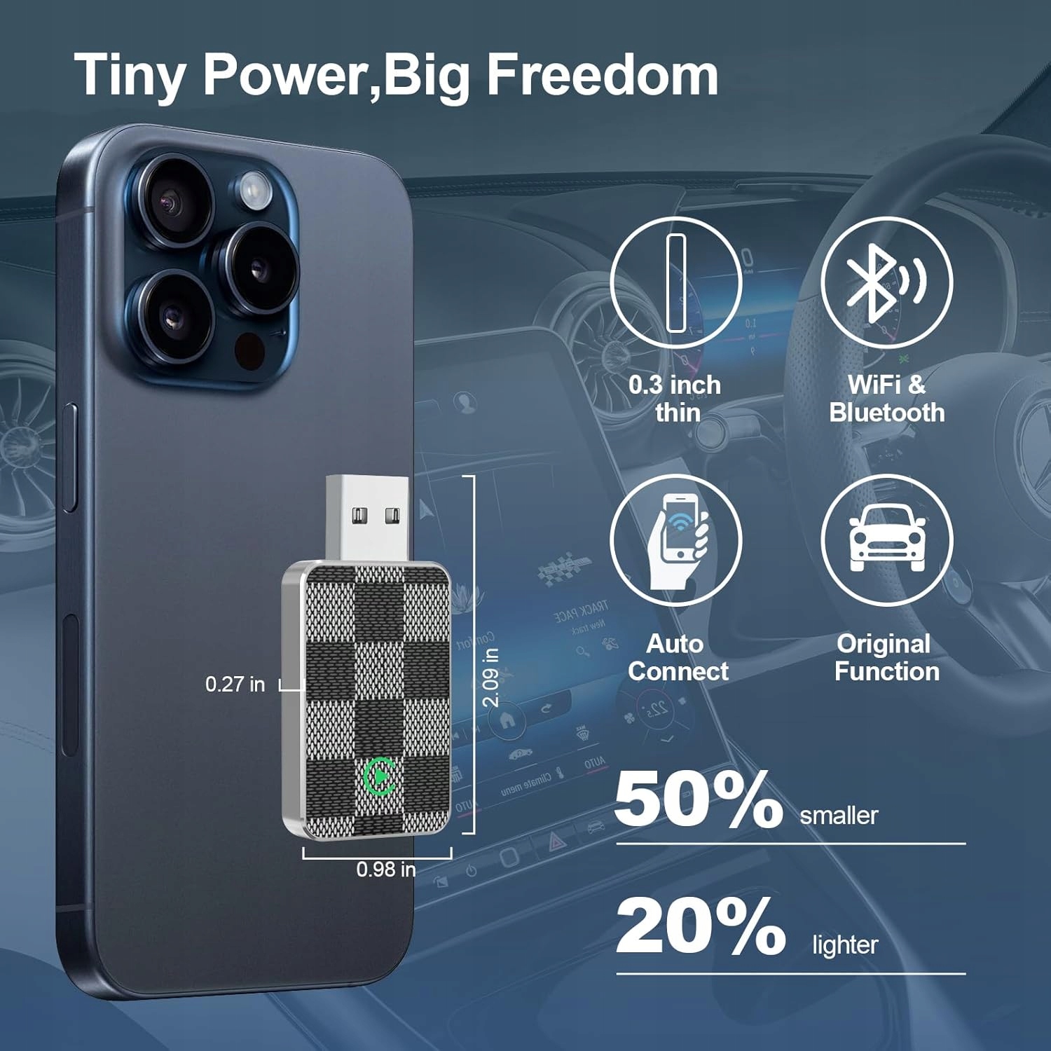 - ✅ **Підходить до будь-якого автомобіля, залишається прихованим! ** – Надкомпактний (менший за автомобільний ключ!) і легкий, цей бездротовий ключ Mini Carplay акуратно вставляється в порт USB, не блокуючи інші елементи керування. Без брудних кабелів чи громіздких насадок