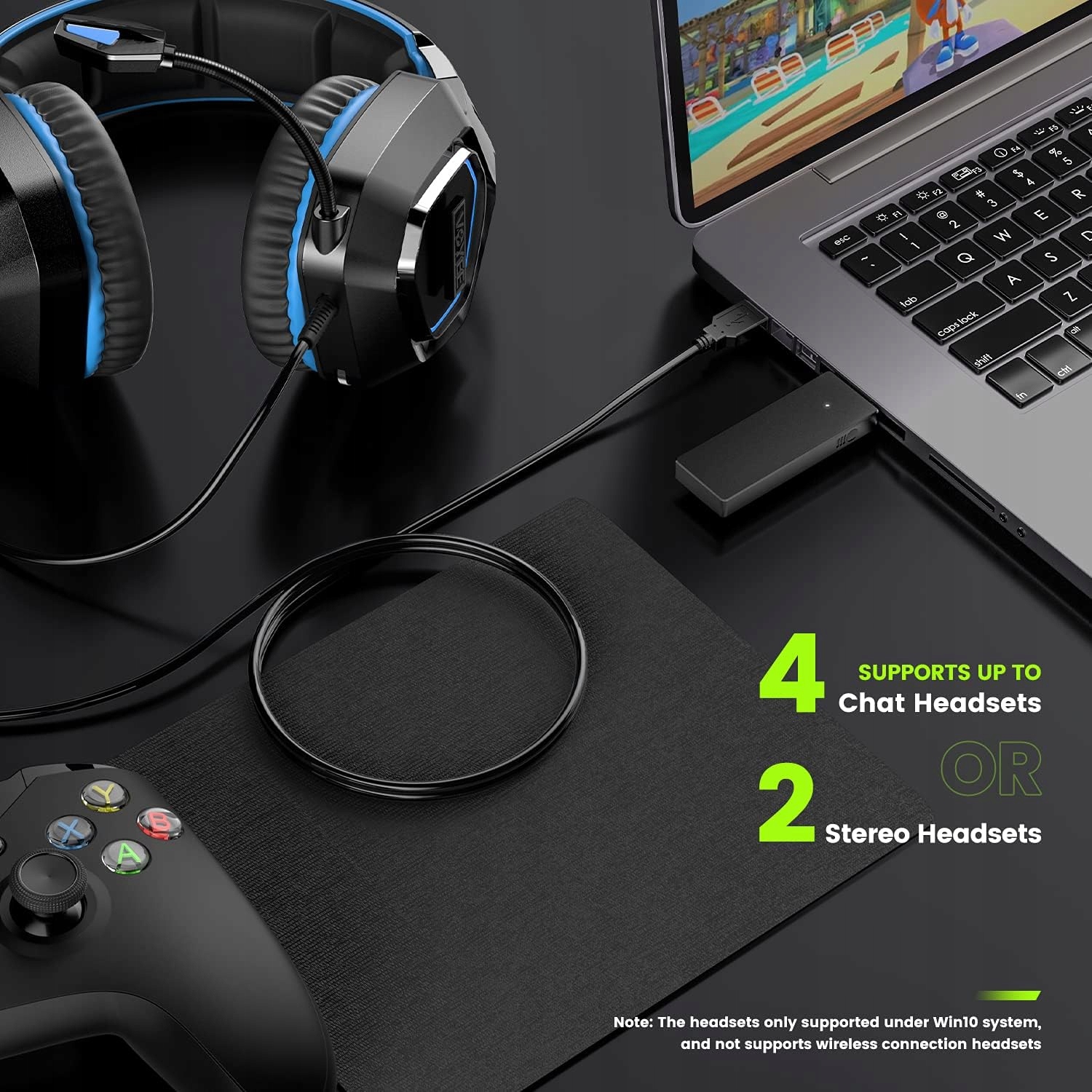 Підтримує до 8 бездротових контролерів. Також підтримує використання дротових гарнітур для спілкування в чаті на контролері (Примітка: гарнітури підтримуються лише в WIN10 і не підтримують бездротові гарнітури)