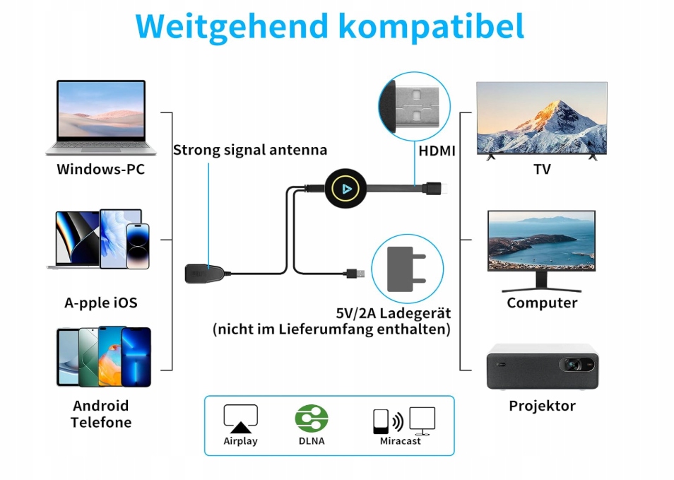 - Широка сумісність: адаптер працює з пристроями з iOS (iPhone, iPad), Android, Mac OS та Windows. Він підтримує стандарти Miracast, AirPlay і DLNA, що забезпечує універсальне використання.