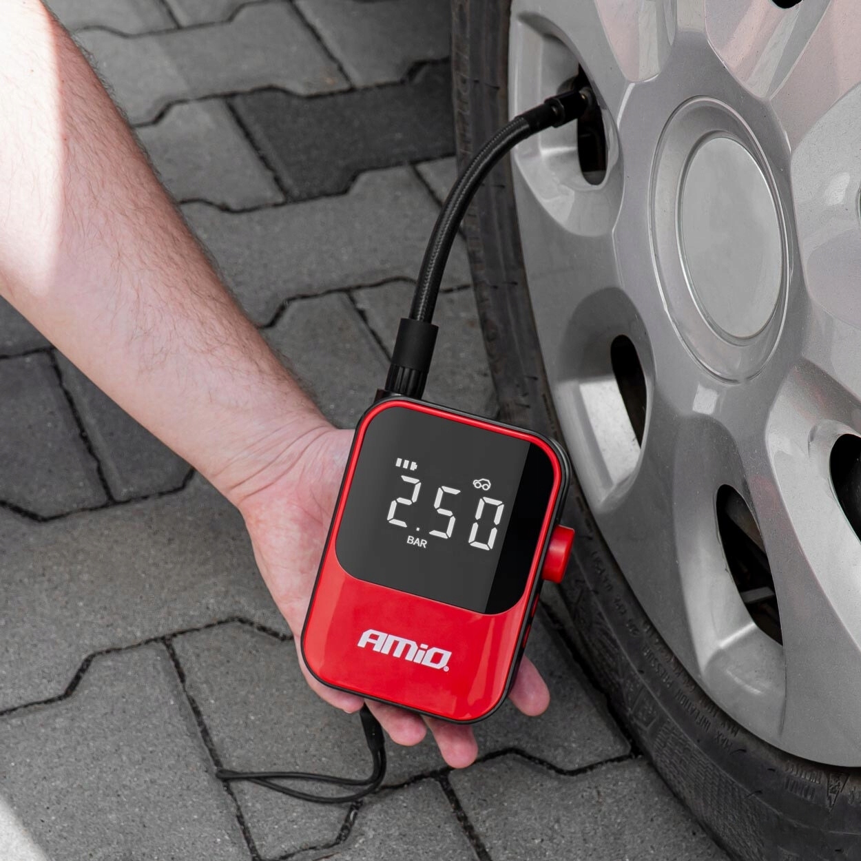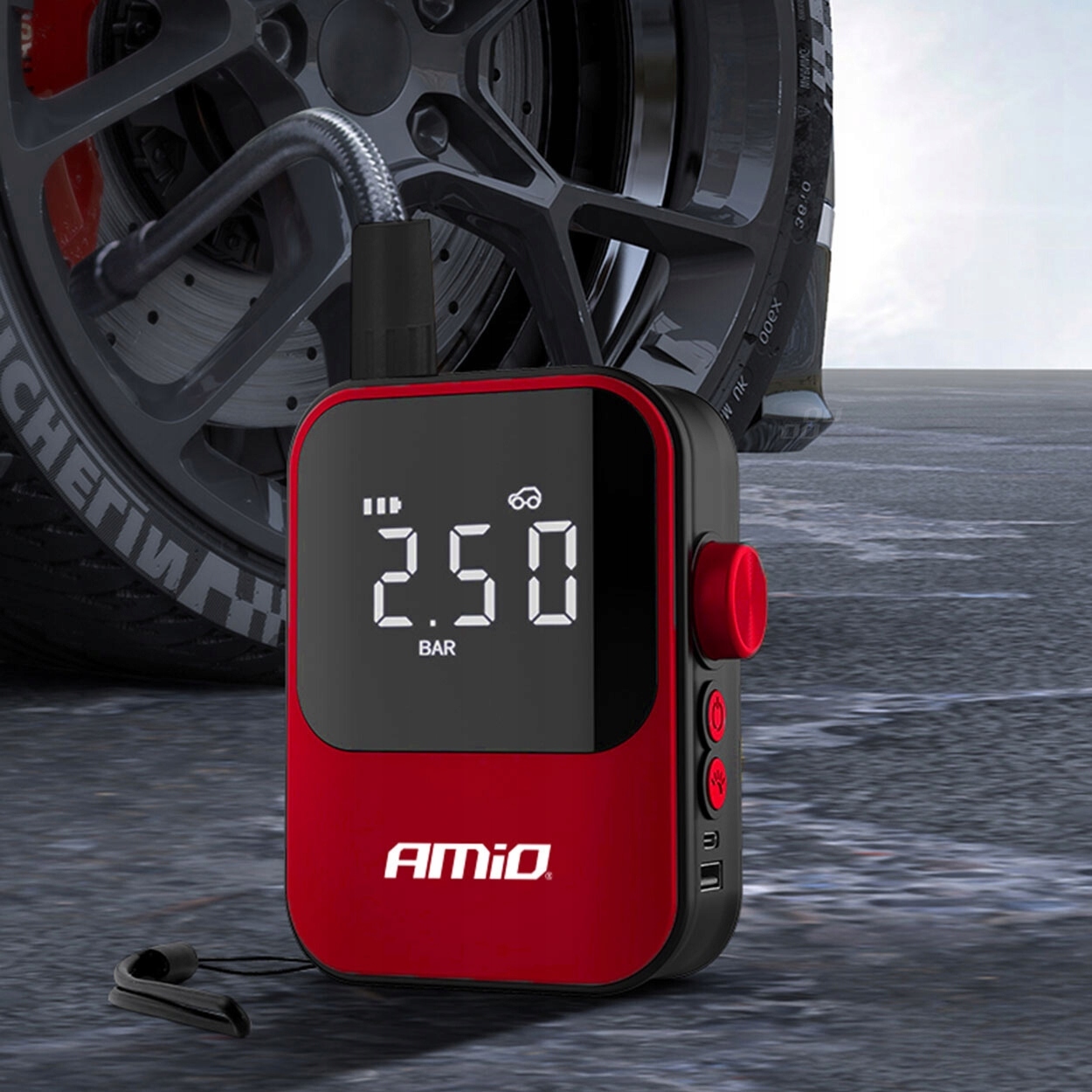 Невеликий розмір портативного компресора дозволяє легко брати його з собою в будь-яку подорож. На цифровому дисплеї ви знайдете важливу інформацію, таку як вибраний режим роботи, тиск у шинах і стан заряду акумулятора. Керувати нимзручно за допомогою кількох кнопок.