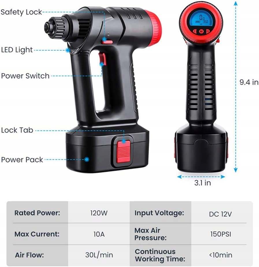 Перезаряджуваний повітряний компресор Портативний насос для накачування шин Ручний повітряний насос із цифровим РК-дисплеєм 12 В 130 PSI Літій-іонна батарея Бездротовий повітряний компресор із великою ємністю 2200 мАг та літієвим акумулятором без клопоту про шнур живлення. Його також можна живити як від літій-іонного акумулятора, так і від адаптера на 12 В для подвійного використання та безпроблемних сигар. Автоматичне відключення - просто встановіть потрібний тиск за допомогою насоса для накачування шин, а потім увімкніть насос для підкачування шин - він автоматично вимикається, коли досягається правильний тиск у шинах. Дуже простий у використанні Швидке накачування Накачує спущені шини приблизно за 2 хвилини або менше. Його ефективний автомобільний насос потужністю 120 Вт перекачує повітря з вражаючою потужністю 35 л/хв, що є набагато потужнішим і швидшим, ніж традиційний насос.Чудова продуктивність і тривалий термін служби, шинний насос підходить для всіх малих і середніх автомобільних шин, включаючи позашляховики, велосипеди, мотоцикли. Оснащений 3 адаптерами для надувних матраців, іграшок і спортивних надувних човнів.
