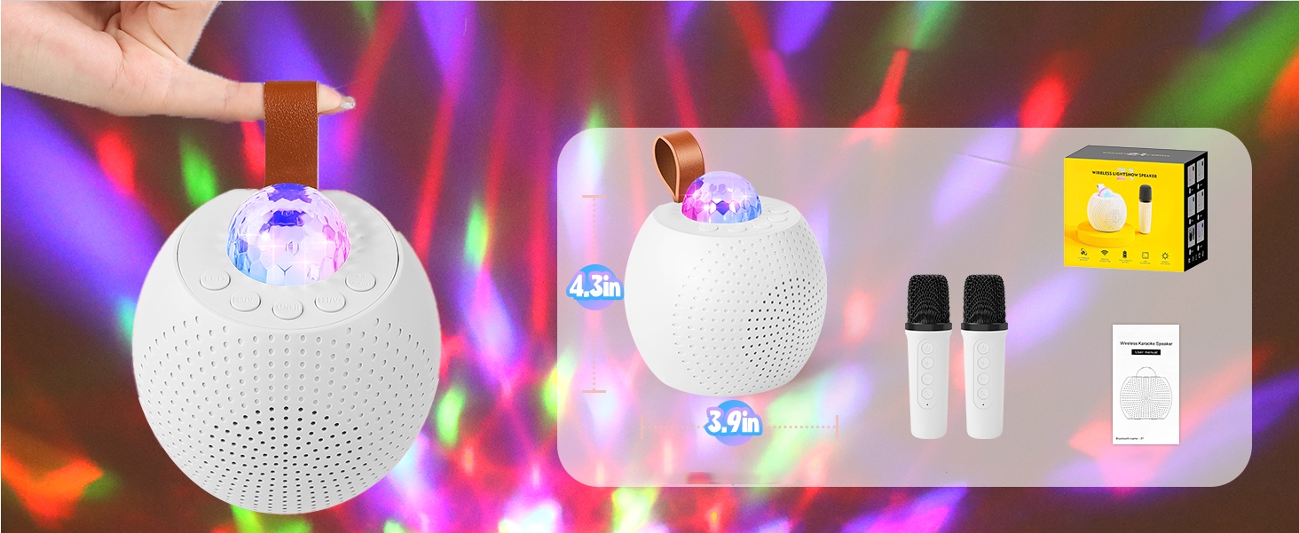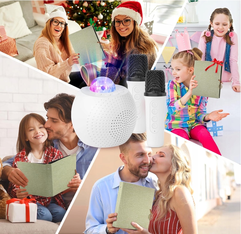 - Портативне обладнання для караоке ідеально підійде для будь-якої зустрічі, незалежно від того, чи це сімейна вечірка, зустріч з дітьми чи вечір з друзями. Ця міні-караоке-машина, оснащена мікрофонами та яскравими світлодіодами, створює захоплююче та розважальне середовище.
