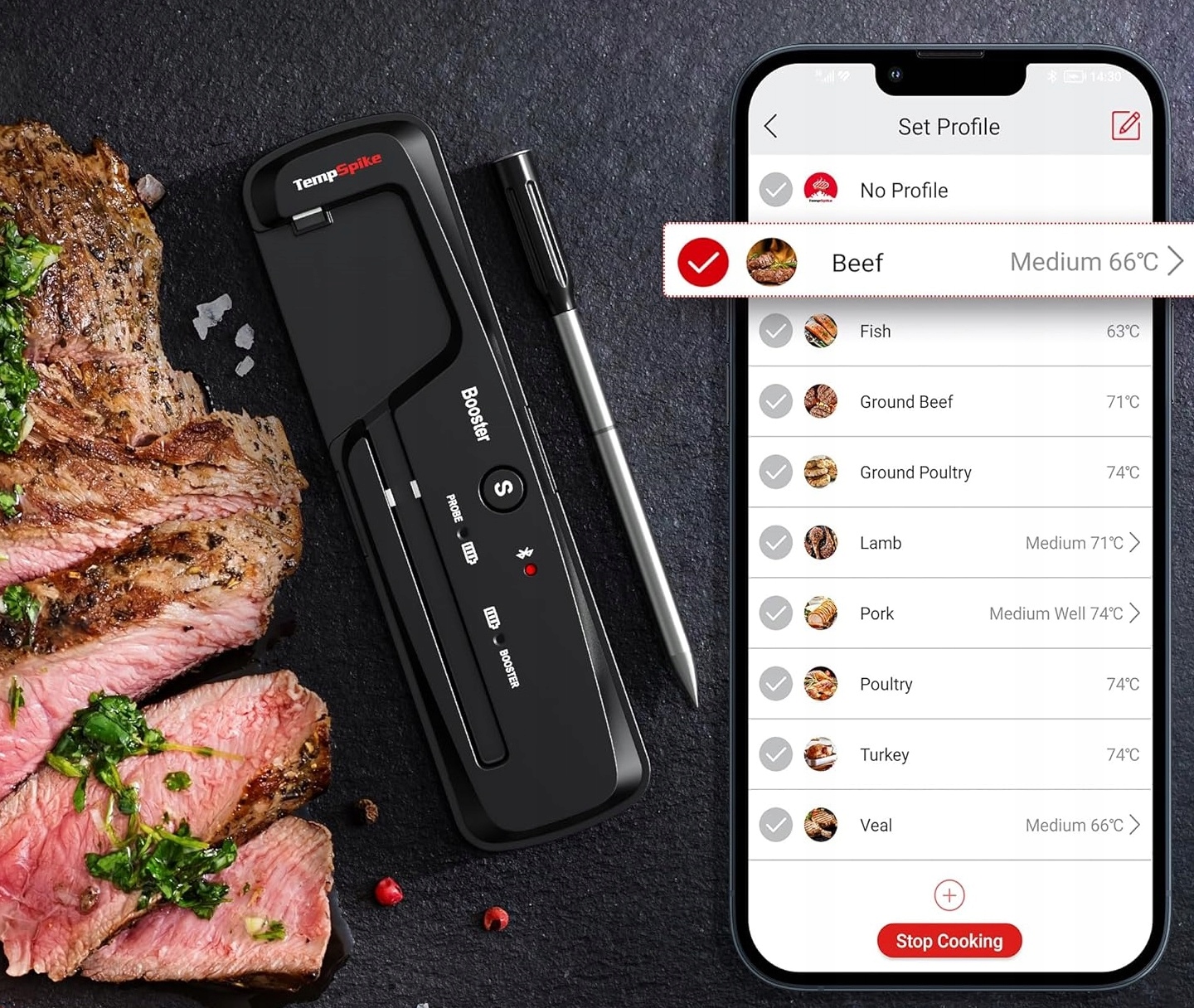 ▶️ Жодних кабелів, жодного безладу: зонд працює повністю без проводів і передає дані за допомогою підсилювача Bluetooth. Ви обираєте тип м’яса, встановлюєте температуру, і телефон сповістить вас звуковим сигналом, коли все буде готово!