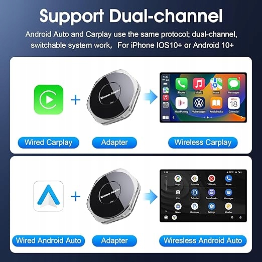 Унікальна двоканальна структура бездротового адаптера Carplay для автомобіля полегшує перетворення бездротового Carplay CarPlay або дротового Android Auto до бездротового Android Auto. Наш бездротовий адаптер легко налаштувати, і після першого успішного з'єднання автоматично з'єднується щоразу, коли автомобіль запускається в майбутньому (Bluetooth та Wi -Fi увімкнено), що робить подорожі простішими та швидшими.