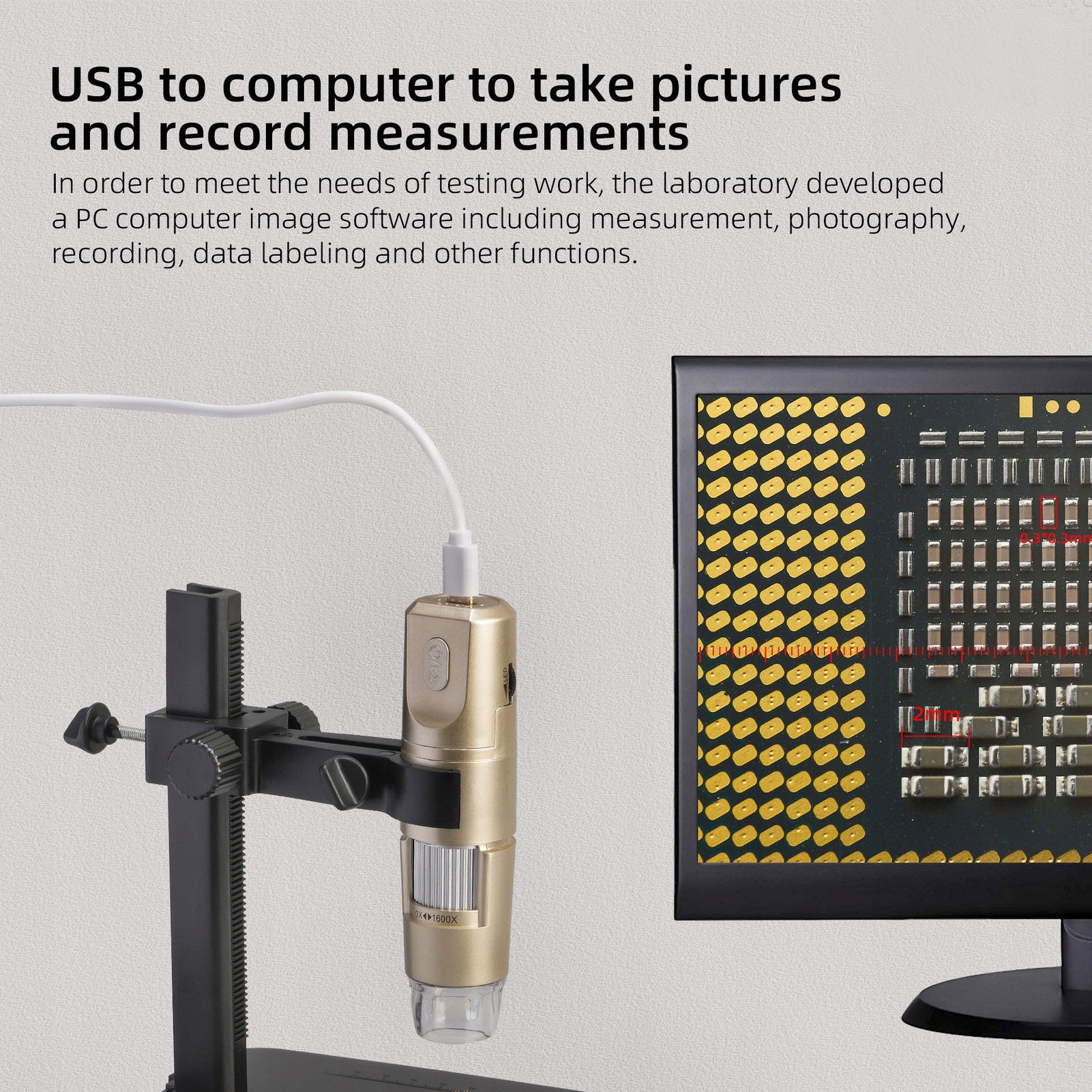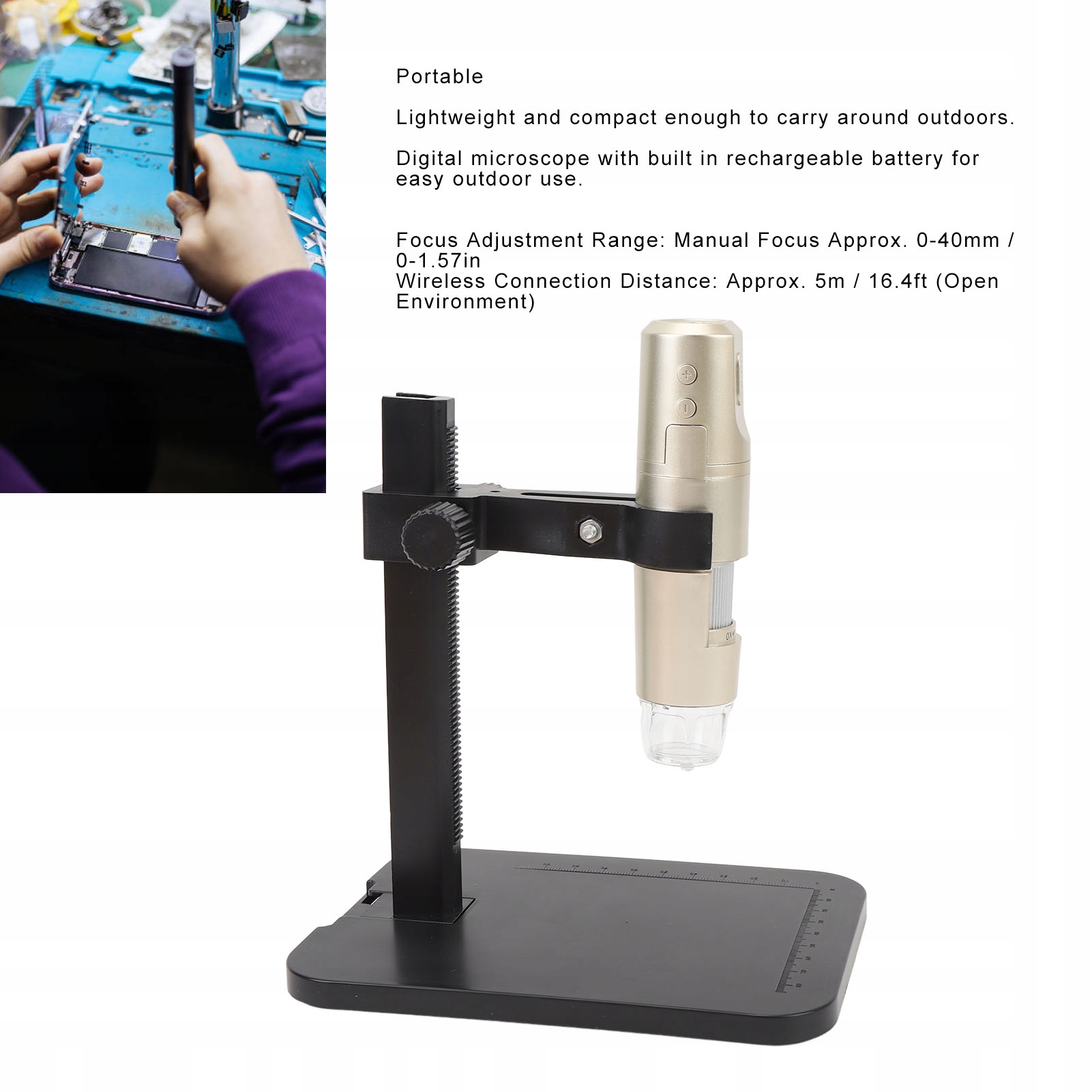 - Збільшення: 0-1600X Регулювання фокусу: вручну фокусування нормально. 0-40 мм/0-1,57 дюйма