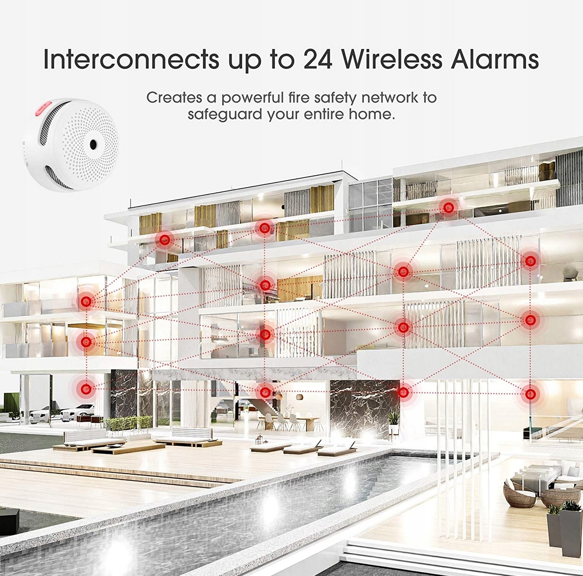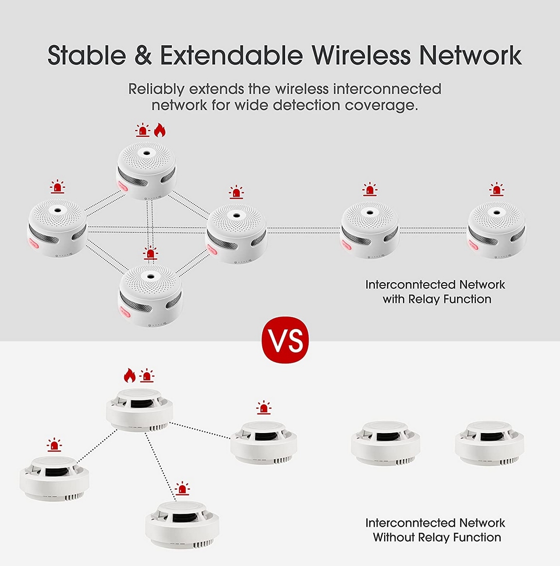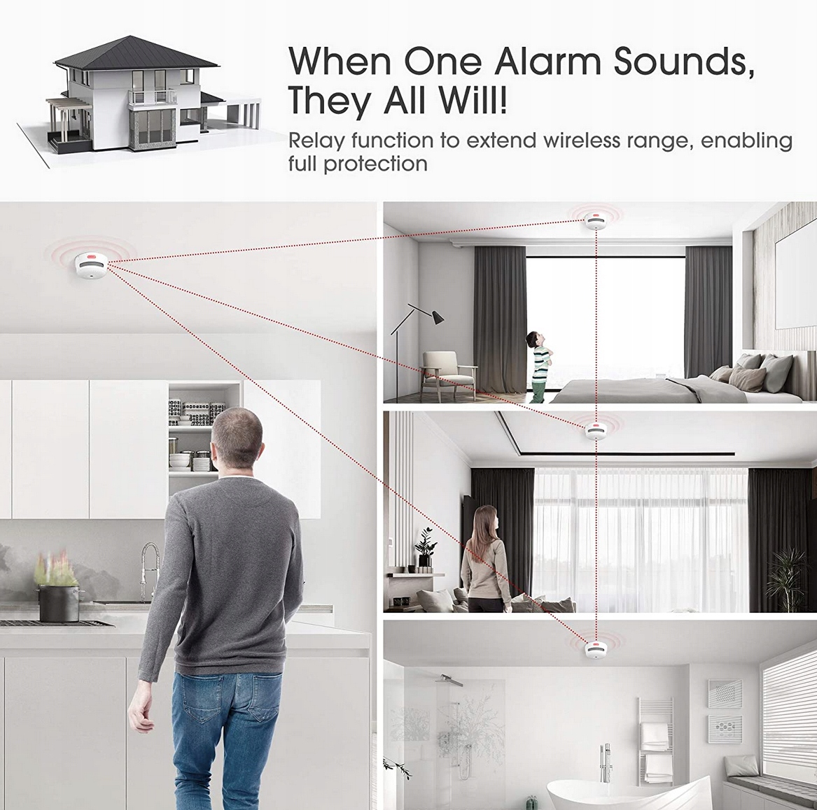 Завдяки функції передавача, який збільшує дальність передачі, цей радіодетектор диму можна підключити до 24 бездротових сигналізацій для створення інтелектуальної домашньої мережі без мертвих зон, навіть на різних поверхах, у підвалах і гаражах.