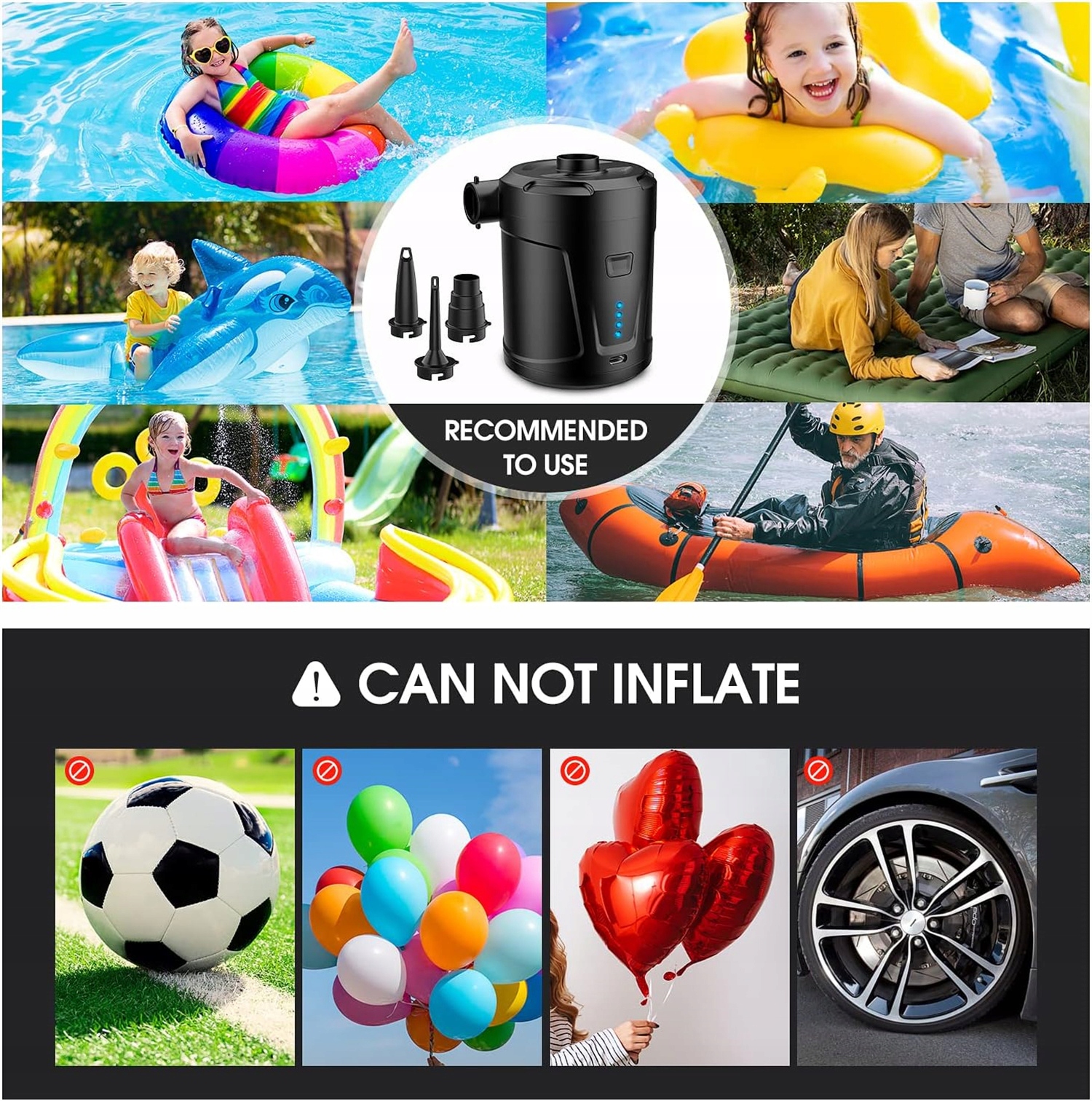 【3 різні форсунки】- електричний повітряний насос оснащений 3 різними типами форсунок, які можуть задовольнити ваші різні потреби в насосах. Цей матеріал ідеально підходить для виробництва подушок безпеки, матраців, надувних басейнів, плавальних коліс, басейнів з веслами, кулями йоги, повітряних куль та інших надувних предметів. Крім того, його також можна використовувати у вакуумних мішках для зберігання продуктів для сну з них зайве повітря.