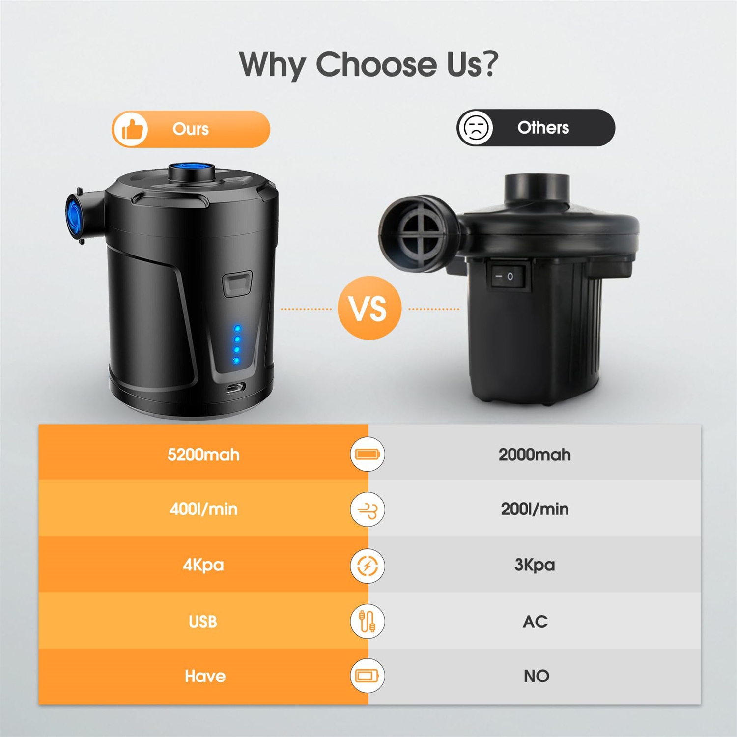 【Довгостроковий джерело живлення та зарядка через USB】-електричний повітряний насос із вбудованим завантажуваним літієвим акумулятором потужністю 5200 мАг, що забезпечує більш тривалий робочий час. Крім того, набір включає USB -зарядний кабель, тому ви можете використовувати будь -який пристрій з USB -портом (наприклад, автомобільна розетка, комп'ютер або мобільний джерело живлення), тому ваша літня поїздка буде ще більш зручною! Просто покладіть повітряну насадку в клапан і увімкніть перемикач. Запровадження та спорожнення об'єкта займає від десяти секунд до декількох хвилин (залежно від розміру об'єкта). Скоротити час очікування та полегшити гру чи відпочинок!