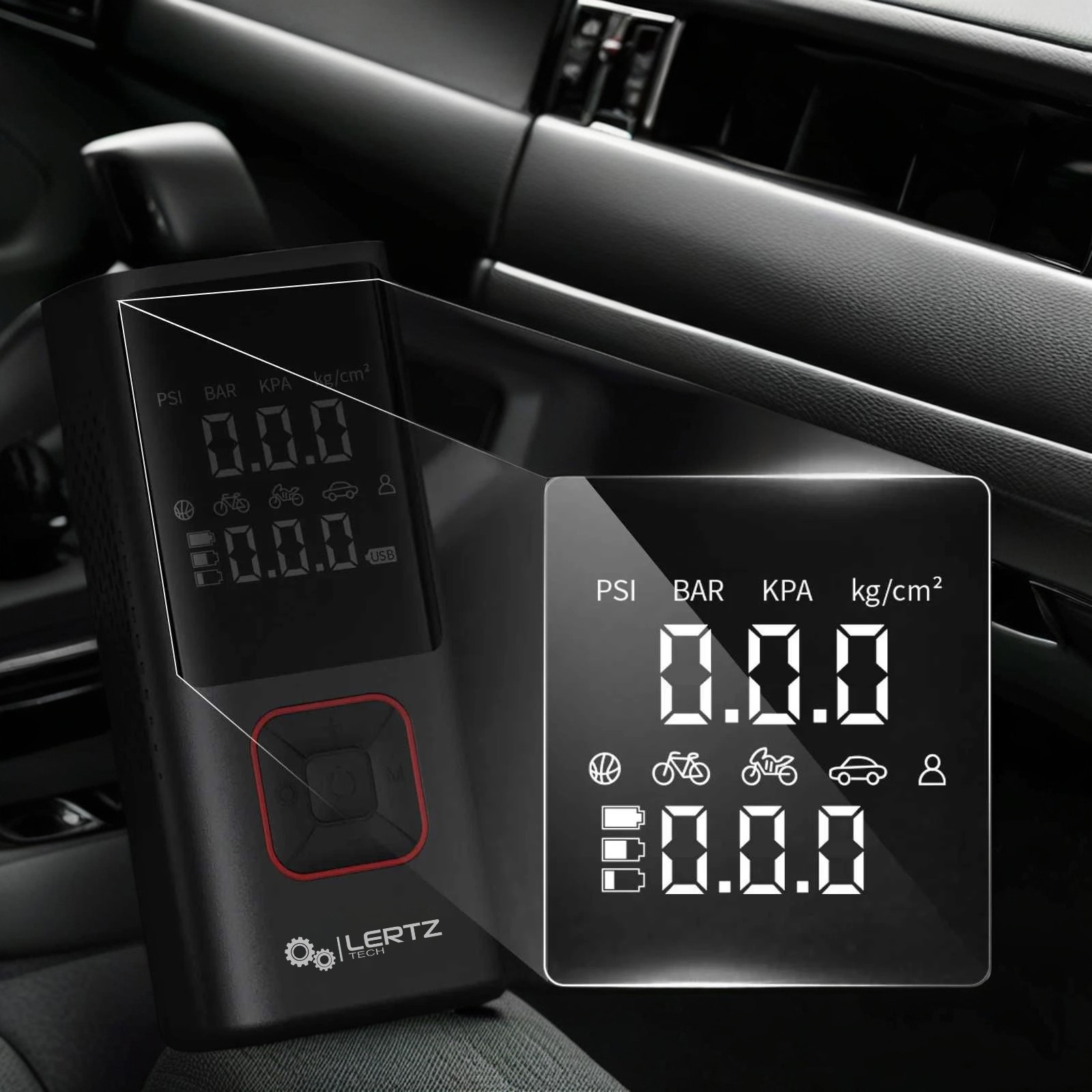 Пристрій LERTZ 3 GEN має точний манометр у шинах та РК-дисплей, що показує значення тиску в реальному часі.