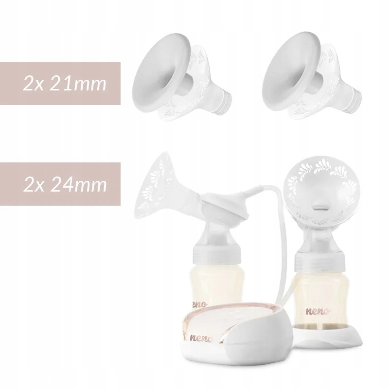 Воронки молоковідсмоктувачів серії Neno виготовлені з ніжного японського силікону, який ідеально адаптується до чутливої шкіри жіночих грудей. У набір Neno Bianco входять не тільки 2 лійки стандартного розміру 24 мм, а й 2 лійки 21 мм, які призначені для менших сосків.