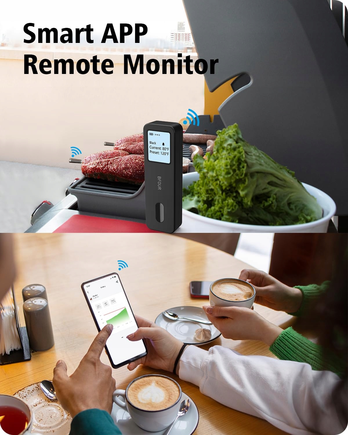 - 【Заряджання та водонепроникність】Бустер може працювати понад 40 годин на одному заряді, а зонд може працювати до 60 годин на 1 хвилині заряджання. Цей бездротовий зонд для м’яса виготовлений із нержавіючої сталі, сертифікованої за стандартом IP67, яку легко чистити та можна мити в посудомийній машині. повідомлення про готовність м'яса. Завдяки додатку розумного термометра для м’яса ви отримуватимете сповіщення в режимі реального часу навіть у дорозі.