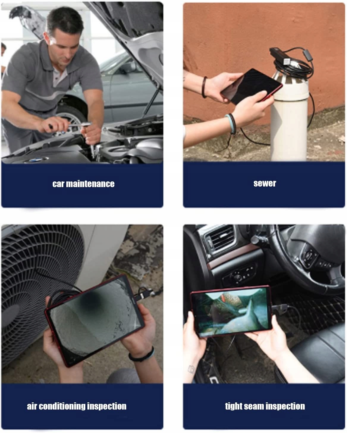 Широко використовується для обслуговування автомобілів, перевірки каналізаційних систем, кондиціонування повітря, щільних швів та інших місць, які неможливо безпосередньо спостерігати очима. Телефонний ендоскоп WiFi Ендоскоп оснащений Wi-Fi і сумісний з кількома мобільними телефонами одночасно. Регульована яскравість Налаштуйте яскравість світлодіодів покращуйте видимість у темних місцях, створюйте чіткі та яскраві зображення, адаптуйтеся до різних середовищ. Об’єктив камери високої чіткості 1200P із роздільною здатністю 1600x1200, оснащений технологією Bluray, покращує чіткість зображення. Водонепроникність IP68. Водонепроникний діаметр становить 8 мм, і навіть більші тверді частки не можуть повністю проникнути.