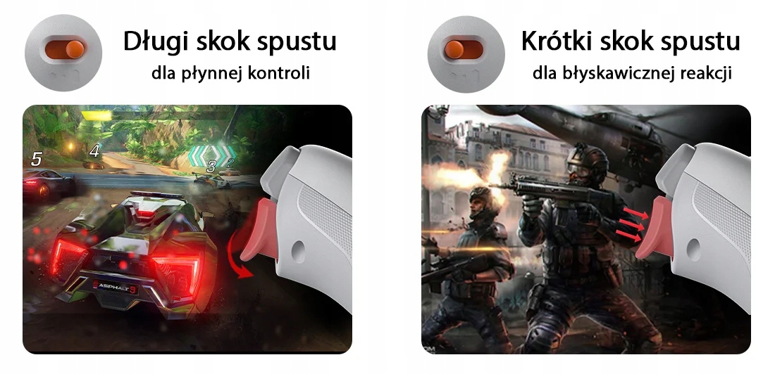 Аналогові тригери з технологією Холла пропонують двоетапне регулювання ходу, що дозволяє ідеально відповідати їх роботі жанру гри - від динамічних перегонів до ігор із вимогливими FPS. За допомогою простої комбінації клавіш (M + LT/RT) ви можете ввімкнути режим тригера для волосся, тобто надшвидку роботу без необхідності застосовувати повний тиск. Це ідеальне рішення для гравців, які очікують як максимальної точності, так і блискавичної реакції.